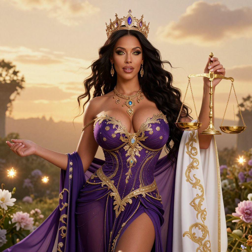 Photograph of a regal woman with long, wavy black hair, wearing an ornate golden crown with a blue gem. She has a tan complexion and is dressed in a revealing, deep purple gown adorned with gold embroidery and jewel accents, highlighting her large breasts. She holds a golden balance scale in her right hand and gestures with her left. Her outfit includes a white and gold-trimmed cape. The background features a sunset sky with warm orange and pink hues, and a garden with blooming flowers. Small, twinkling lights add a magical ambiance.