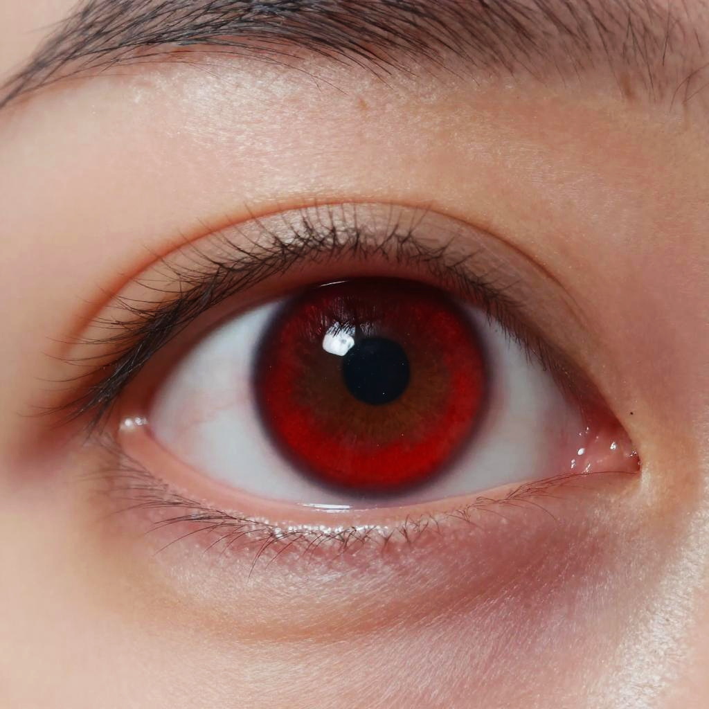 Close-up photograph of a vivid red-brown eye with detailed eyelashes, slightly glossy white sclera, and natural eyebrow, highlighting the eye's depth