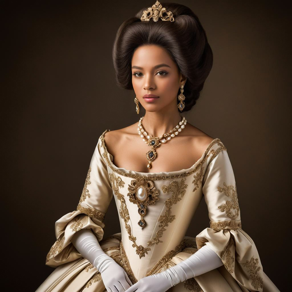 Portrait of a poised woman in an off-shoulder Baroque-style gown adorned with intricate gold embroidery. She wears a pearl necklace with a pendant, matching gold earrings, and white satin gloves. Her hair is styled in an elaborate updo with a gold ornamental hairpiece, set against a brown studio background.