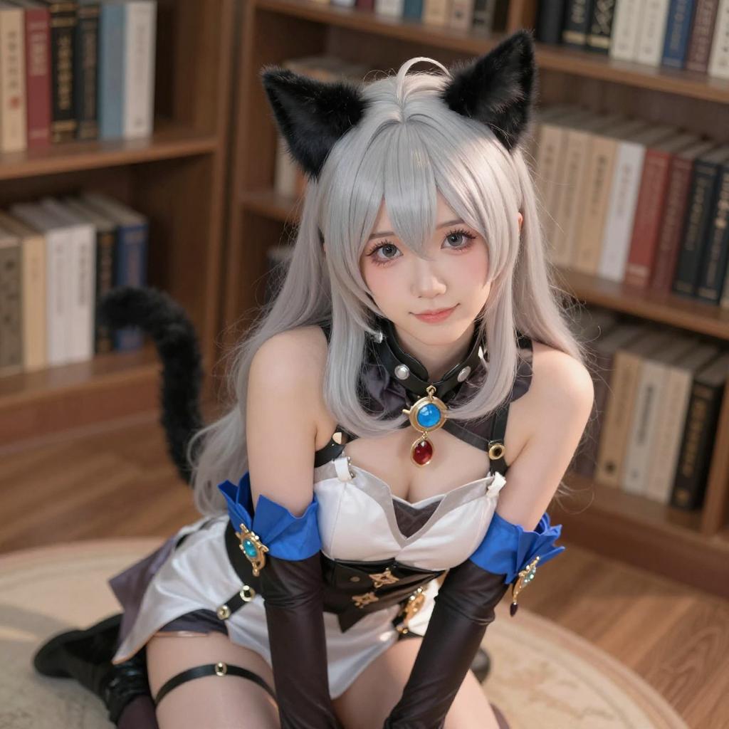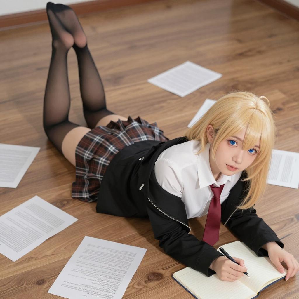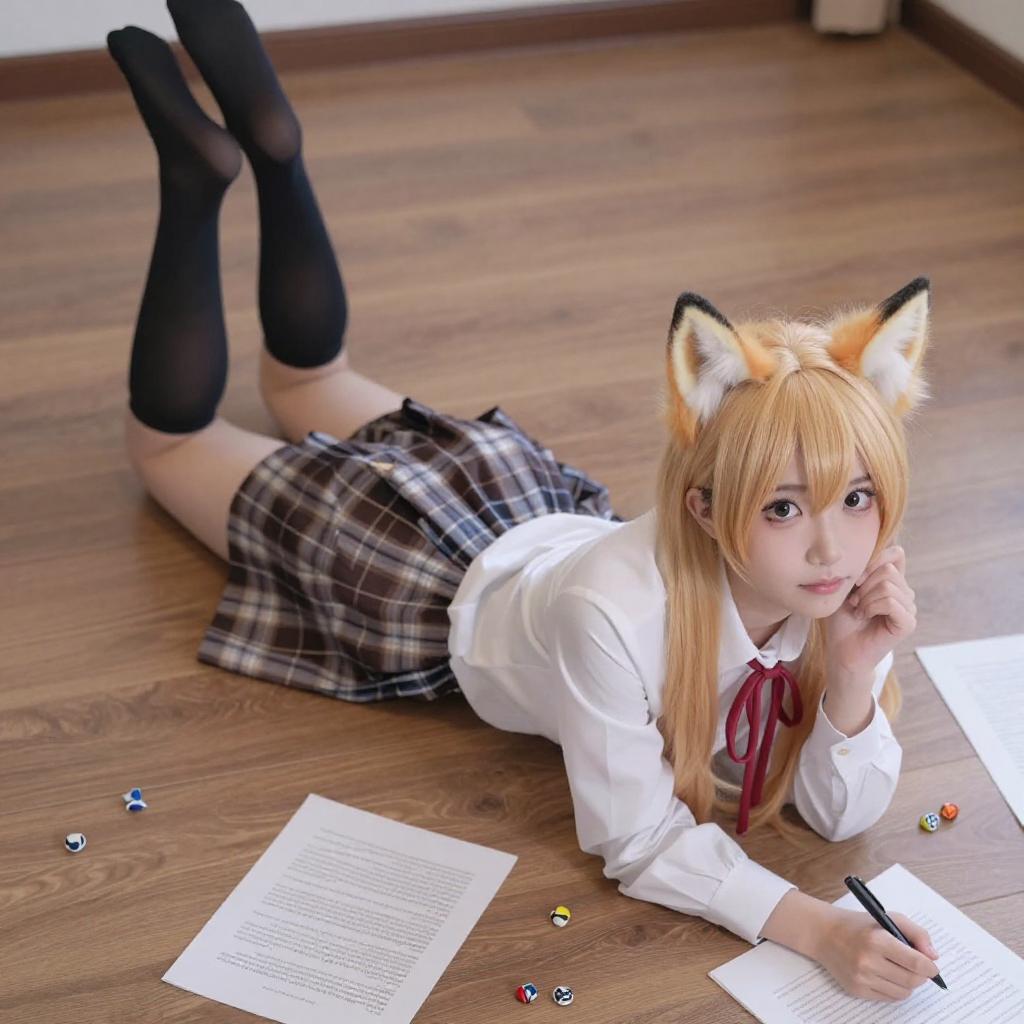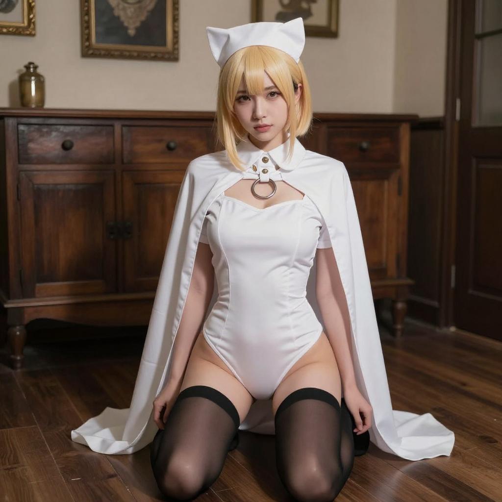 Photograph of a blonde woman in a beige cat-eared hat and cape, sitting on a wooden floor with scattered papers. She is nude except for black thigh-high stockings and a red heart-shaped pendant. She holds glasses in her right hand, with a wooden cabinet and framed picture in the background.