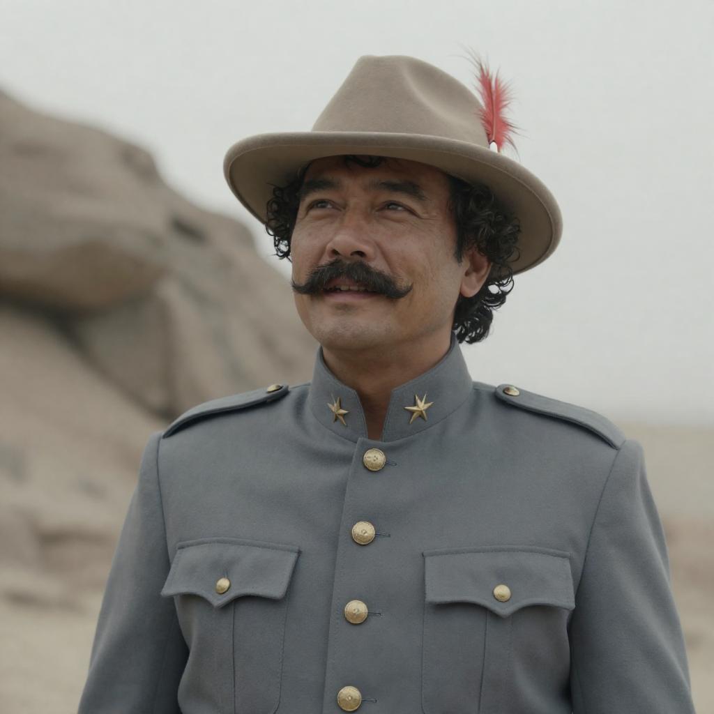 Photograph of a curly-haired man with a mustache, wearing reflective goggles and a white military-style jacket. A woman with a blue feathered hat is partially visible on the left. She holds a small silver object near his goggles. Warm indoor lighting. Man's expression is neutral.