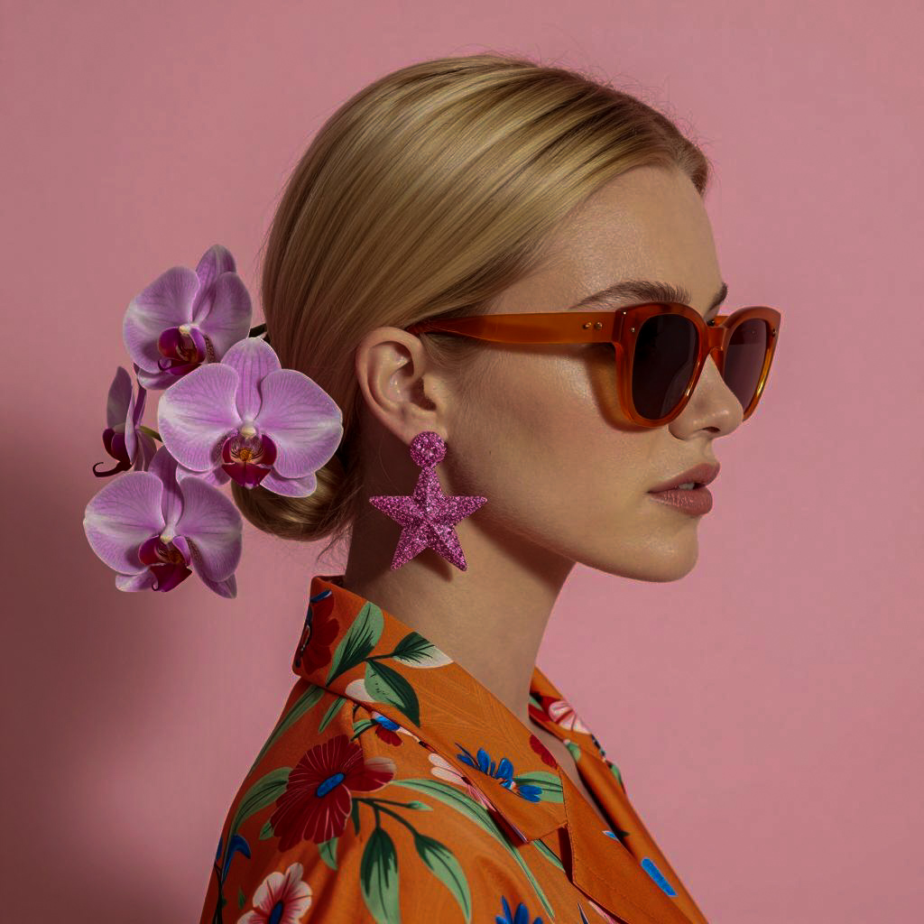 Blonde woman with sleek, back-combed hair wearing large orange sunglasses. Pink orchid flowers in her hair. Bright pink background. Orange floral shirt with red, green, and blue patterns. Large, sparkling pink star-shaped earrings. Side profile, head turned right. Photographic image.