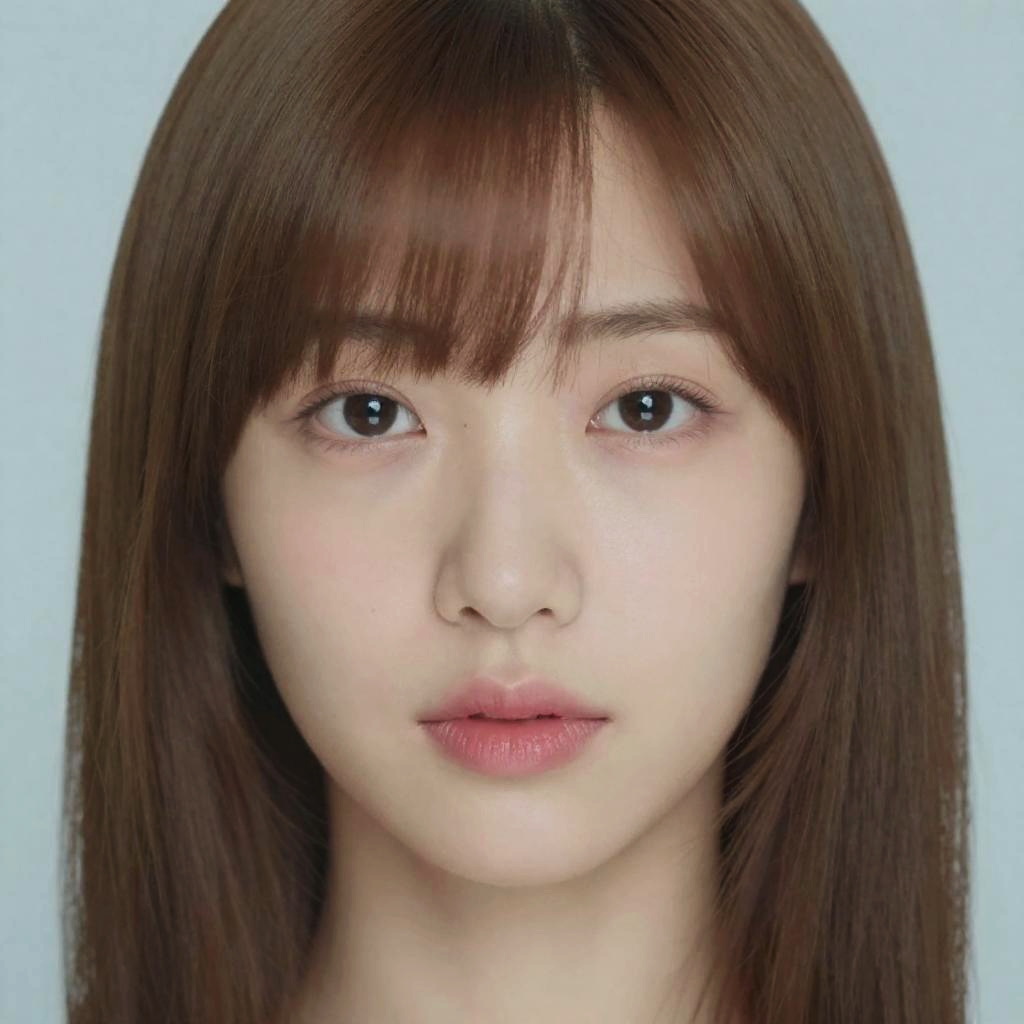 This is a close-up photograph of an East Asian woman with straight, dark brown hair and blunt bangs. She has fair skin, small dark eyes, and a slight smile with natural pink lips. The background is a plain white, making her face the central focus. The image is slightly blurry, giving it a soft, almost digital portrait feel.