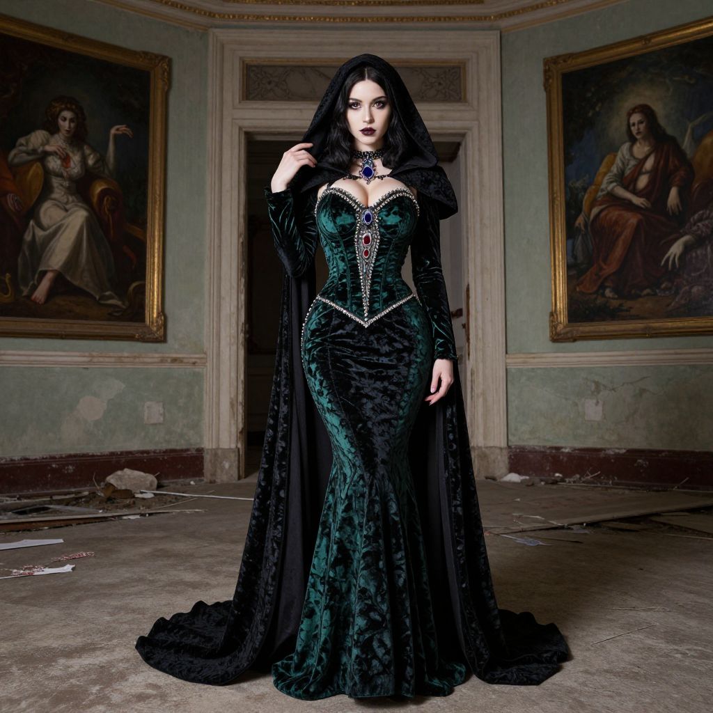 A strikingly beautiful woman with deep brown eyes, high cheekbones, and a sharp nose in a gothic retro cosplay costume made of dark green and black velvet, including a bejeweled bodice, a long flowing train, and a hauntingly beautiful black hooded cloak, posing in the center of an abandoned theater with cracked walls and oil paintings of eerie figures on the walls.. The woman has big tits and cute face