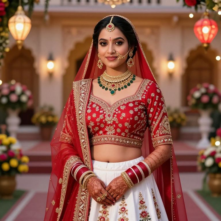 A realistic photograph of a beautiful Indian wedding bride in a traditional dulhan choli design, wearing a beautifully embroidered red and gold choli with intricate zari work, paired with a crisp white lehenga. The bride has a soft, fair complexion, large expressive eyes, and a gentle smile, standing in a grand traditional courtyard during a festive evening with colorful lanterns and floral decorations surrounding her.