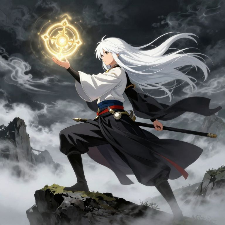 Anime-style digital illustration of a white-haired warrior with glowing magic circle, black kimono, sword, and sash, standing on a rocky cliff under