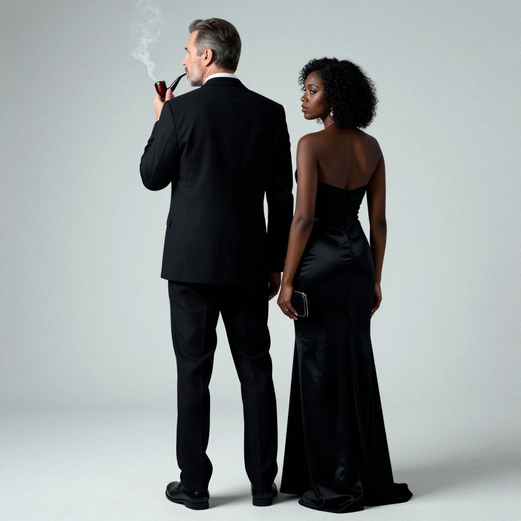 Photograph of a Caucasian man with gray hair in a black suit and a Black woman with curly hair in a black, strapless evening gown. They stand back-to-back, facing different directions. The man is smoking a cigarette, emitting a small plume of smoke, while the woman holds a small black clutch. The background is a plain white, creating a stark contrast with their dark clothing. The man's suit is formal, with a fitted jacket and trousers, while the woman's gown is sleek and elegant, highlighting her dark skin tone. They are positioned in the center of the image, with the man on the left and the woman on the right.