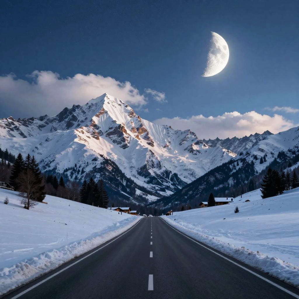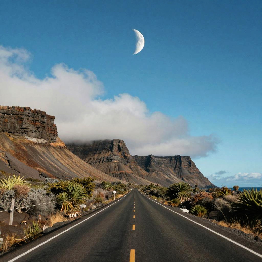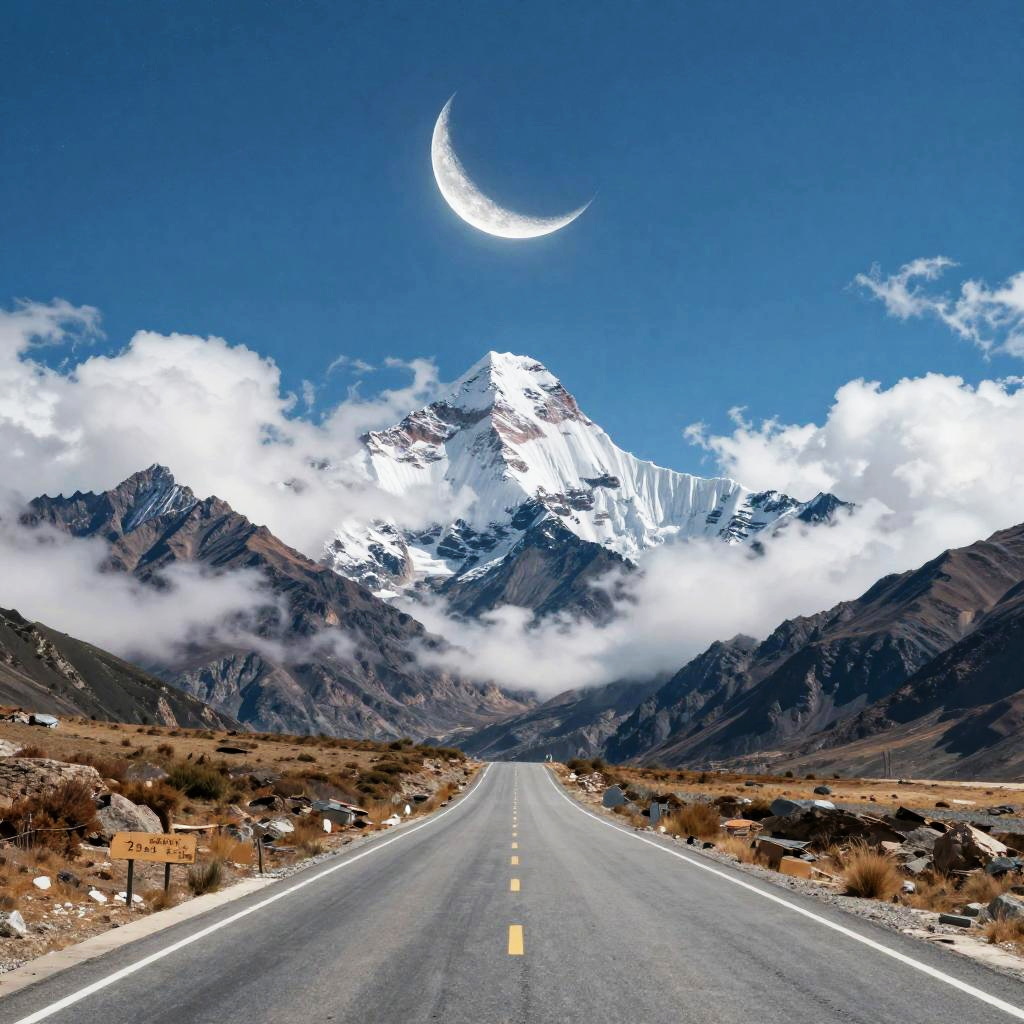 Spinning two-lane road leading toward serene Lake Tahoe, beautiful fluffy clouds peeking from behind mountains, vast starry sky above, sharp majestic waxing crescent moon hangs high above the clouds. Photoshop mixed media cutout artwork style, bright colors.