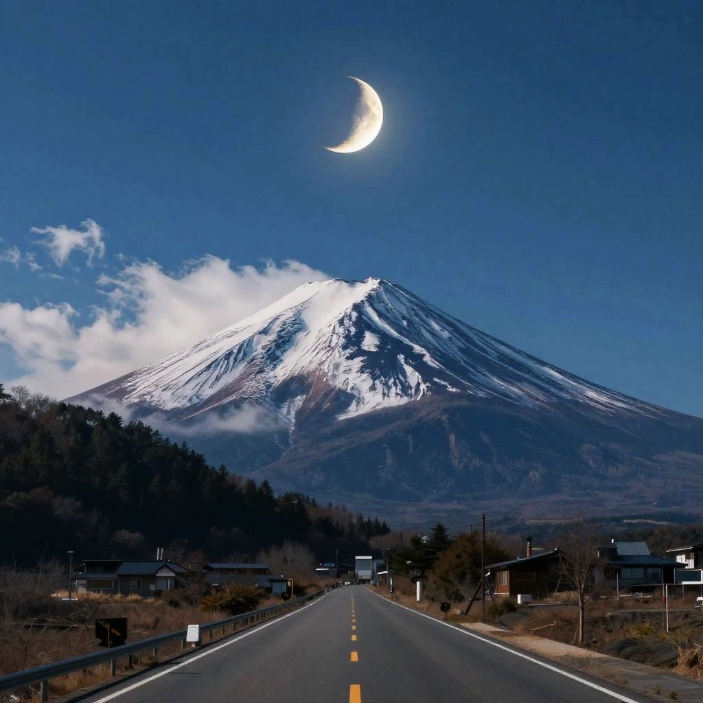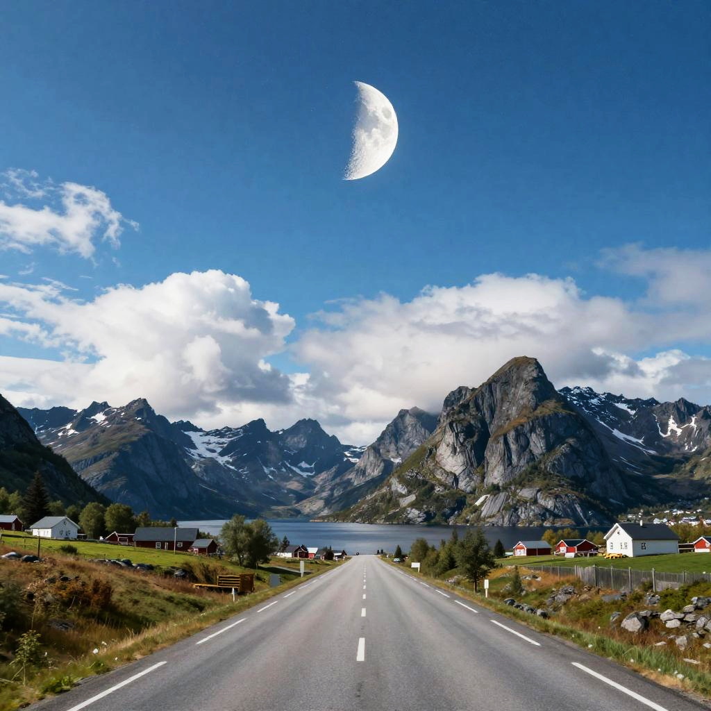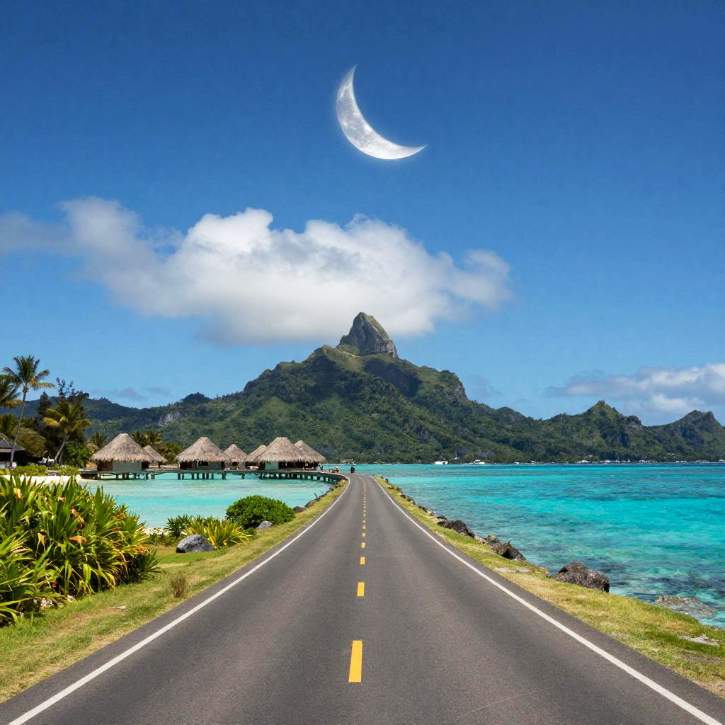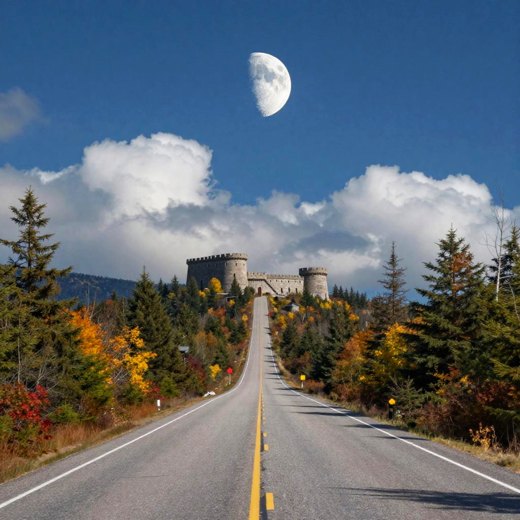 Spinning two-lane road leading toward serene Lake Tahoe, beautiful fluffy clouds peeking from behind mountains, vast starry sky above, sharp majestic waxing crescent moon hangs high above the clouds. Photoshop mixed media cutout artwork style, bright colors.