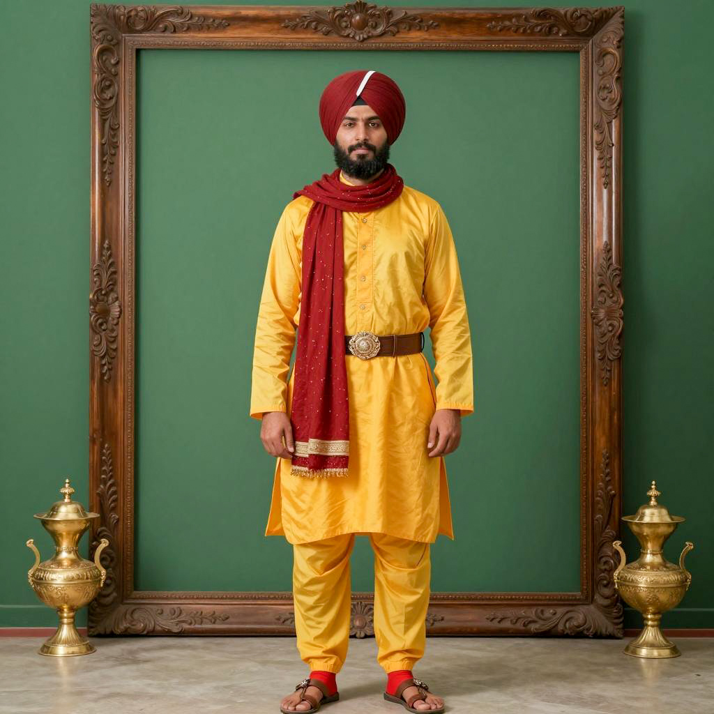 Kashmiri costume, photograph of a bearded Indian man standing, traditional Punjabi outfit, yellow kurta and pants, red scarf, red turban with white stripe, brown belt, red socks, brown sandals, green backdrop, ornate wooden frame, two gold urns on either side, studio lighting, realistic style, detailed ures, regal and traditional atmosphere