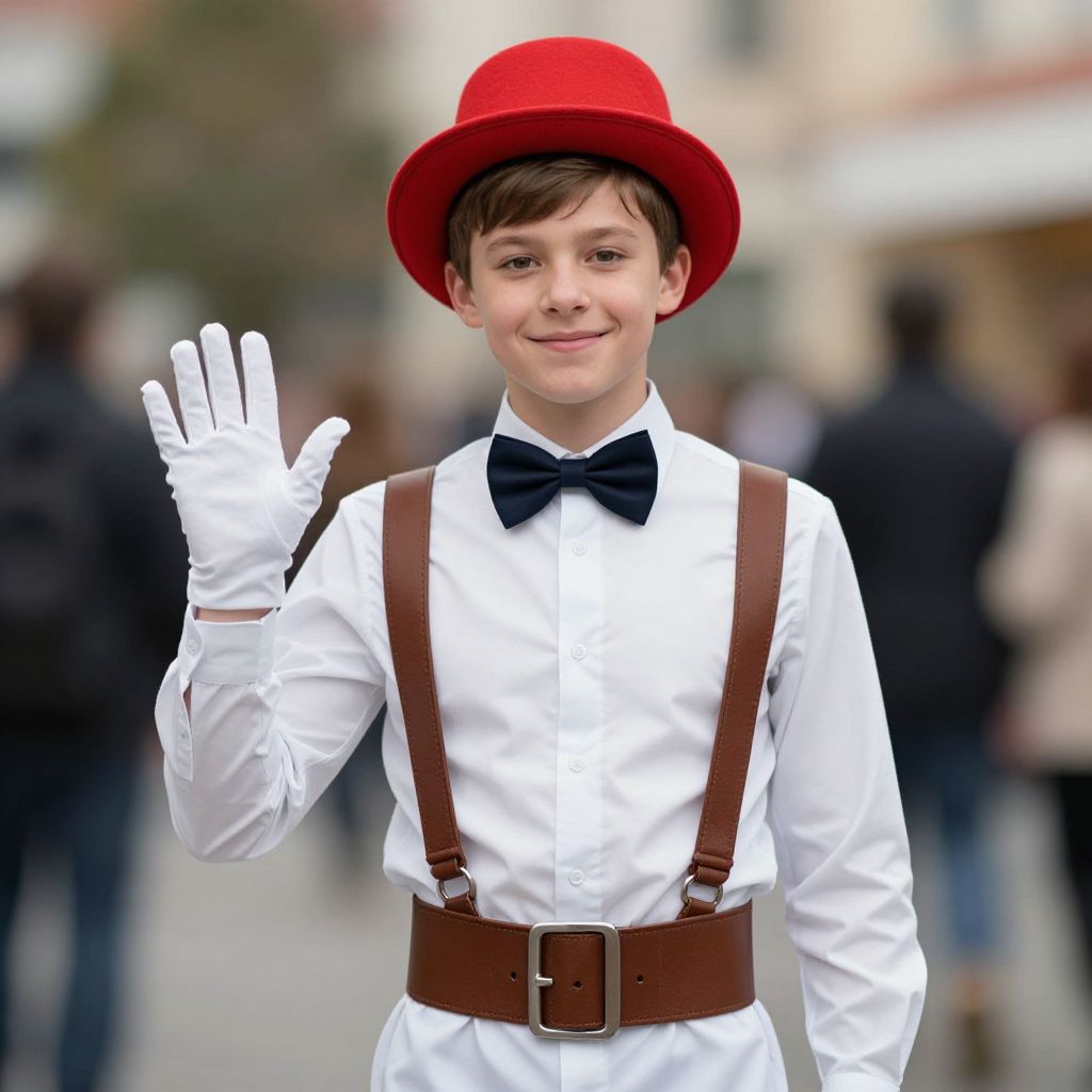 Rodney fancy dress costume, 1boy, male focus, solo, hat, belt, blurry background, looking at viewer, bowtie, blurry, bow, gloves, red headwear, smile, brown belt