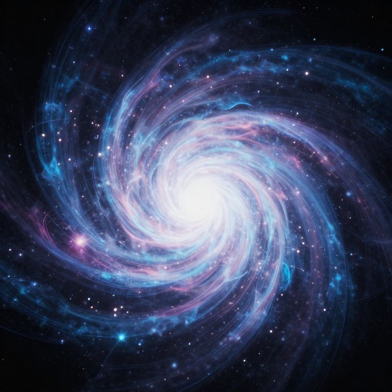 Digital artwork of a vibrant, spiral galaxy against a dark, star-filled background. The galaxy's bright white core is surrounded by swirling, luminous blue and pink nebulae, creating a dynamic, swirling effect. Tiny, scattered stars of varying sizes and brightness dot the dark space, adding depth and contrast. The galaxy's spiral arms are ethereal, with delicate, wispy textures and a sense of motion. The overall composition evokes a sense of vast, cosmic beauty and movement.