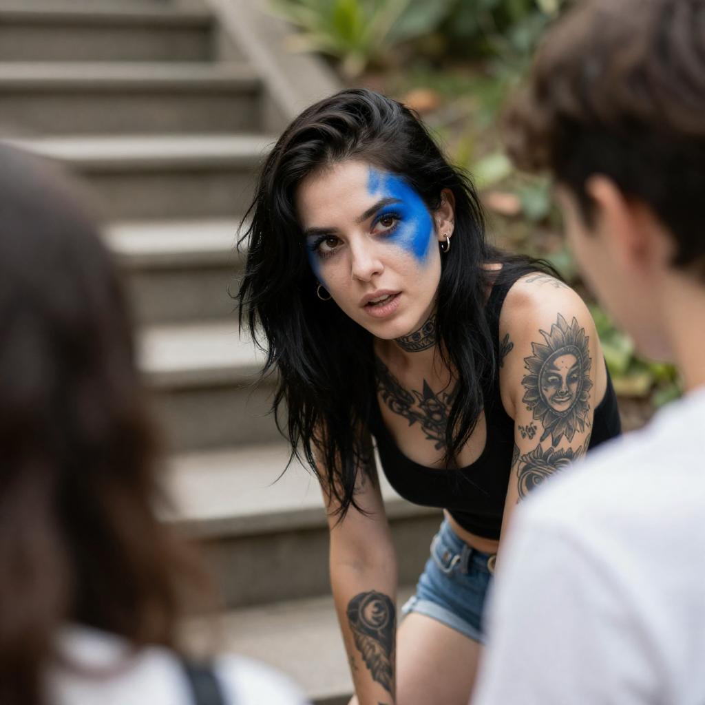 Tattooed Woman with Blue Face Paint Talking Outdoors