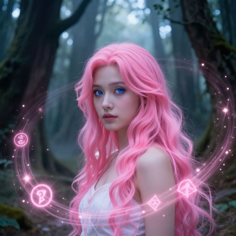 A digital fantasy artwork depicts a young woman with long, wavy pink hair and striking blue eyes standing in a mystical forest. She wears a white, sleeveless top. Pink, glowing magical symbols and circles swirl around her head, contrasting with the dark, misty background of towering trees. Her expression is calm yet slightly enigmatic, and the soft light filtering through the forest adds an ethereal glow to her hair and surroundings. The image blends realism with fantasy elements, emphasizing a magical, otherworldly atmosphere.