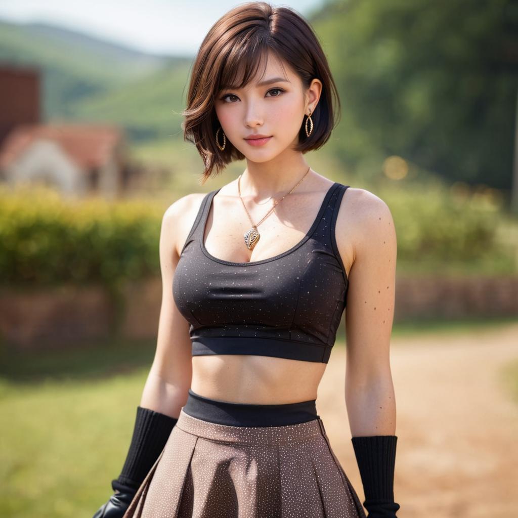 1girl, solo, blurry background, freckles, navel, blurry, midriff, breasts, looking at viewer, outdoors, skirt, jewelry, medium breasts, brown hair, crop top, black hair, realistic, earrings, gloves, cleavage, short hair, tank top, day, bare shoulders, lips