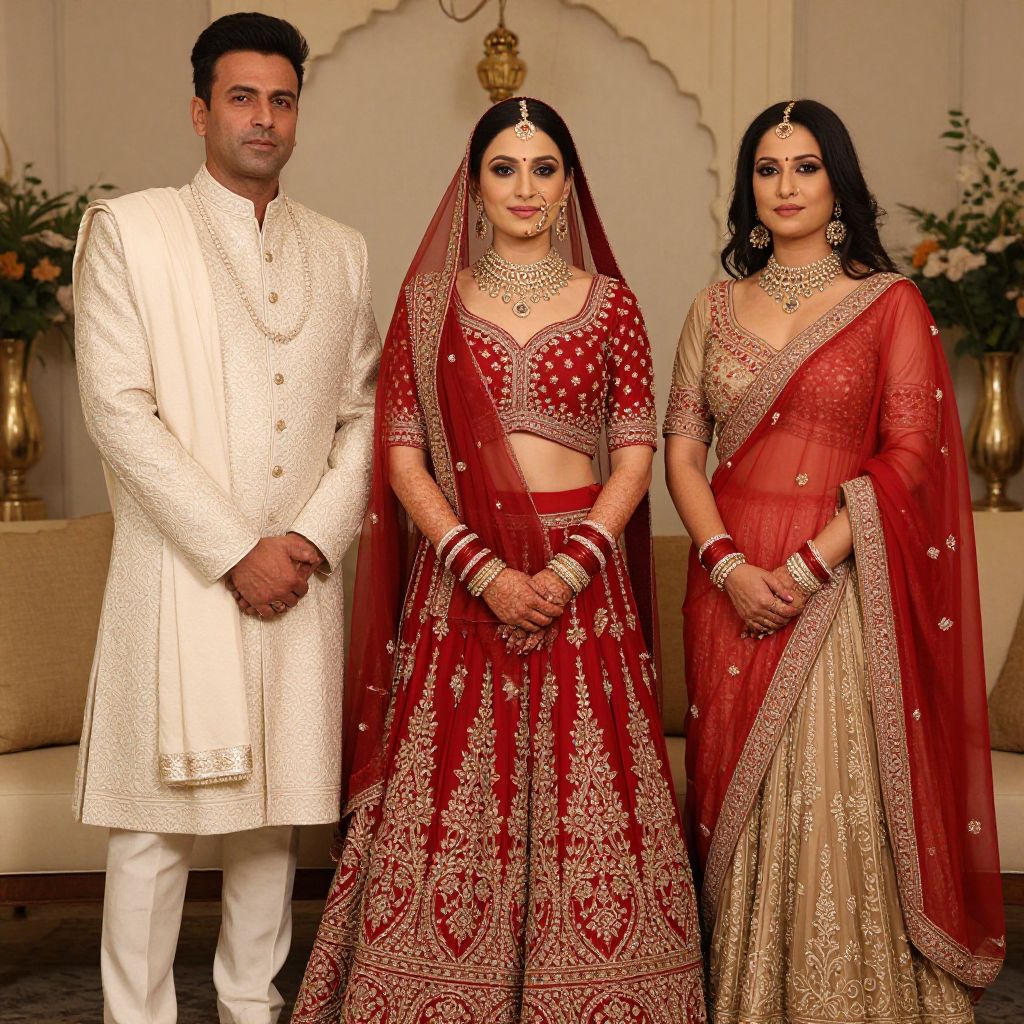Three elegantly dressed individuals stand together in a formal setting, featuring a bride in a vibrant red lehenga adorned with intricate gold embroidery, accompanied by a groom in an ivory sherwani and another woman in a coordinated red and beige ensemble, showcasing quintessential North Indian wedding attire.