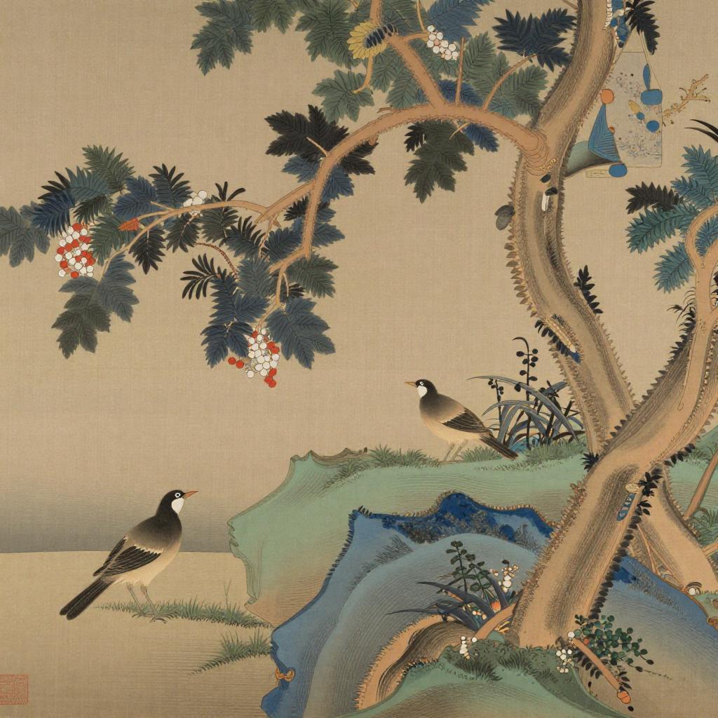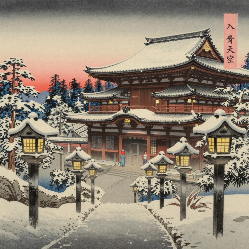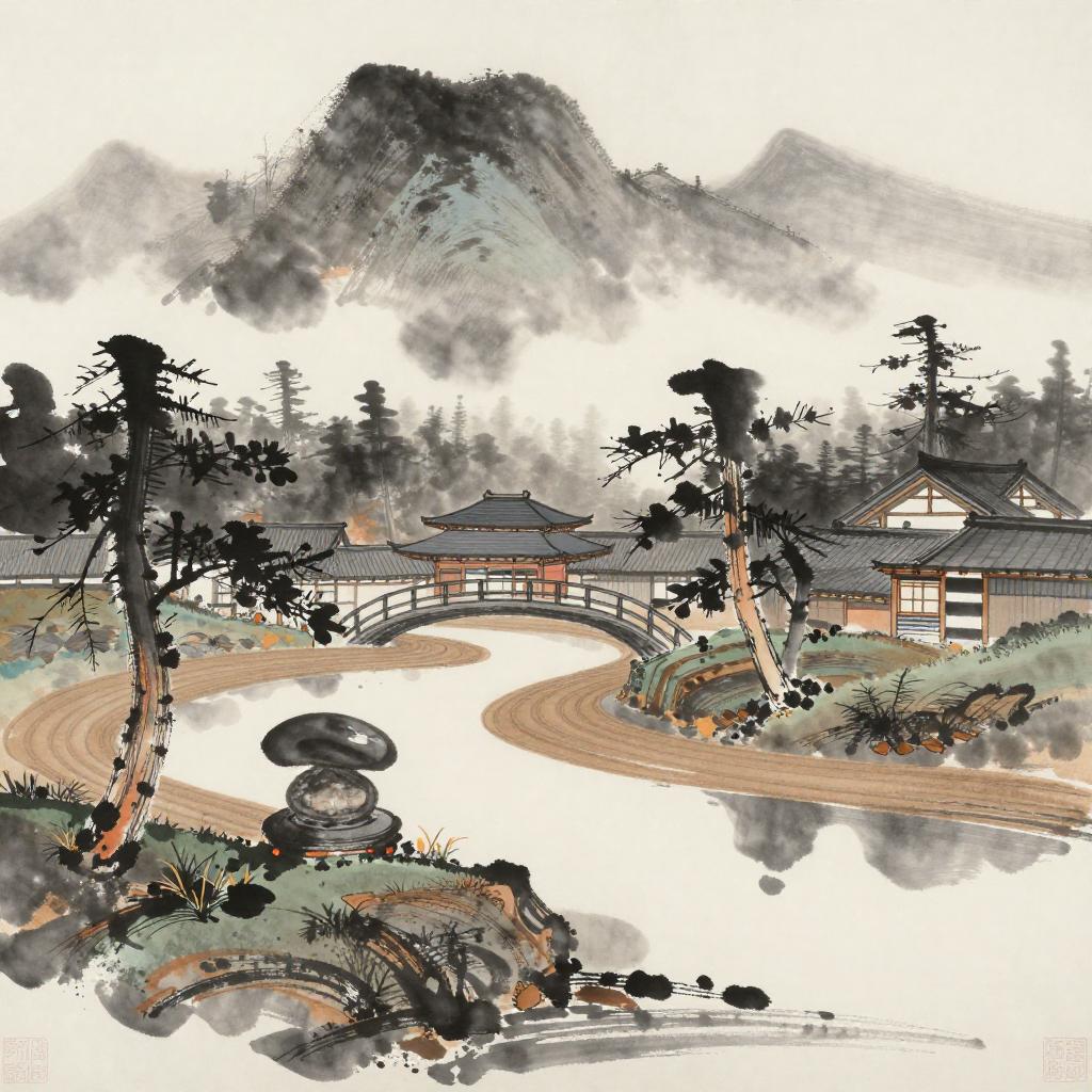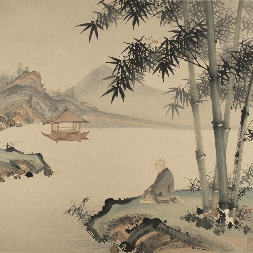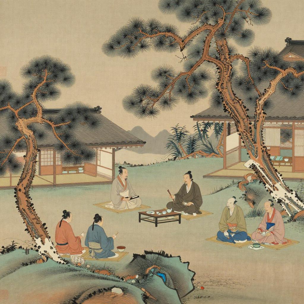 Ike no Taiga, renowned for their Nanga (Bunjinga literati painting) works, creates captivating scenes of Scholar-poets gathered in pine-clad mountain retreats composing calligraphy, ink paintings, and sharing tea at dusk set against a backdrop of traditional Japanese landscapes.