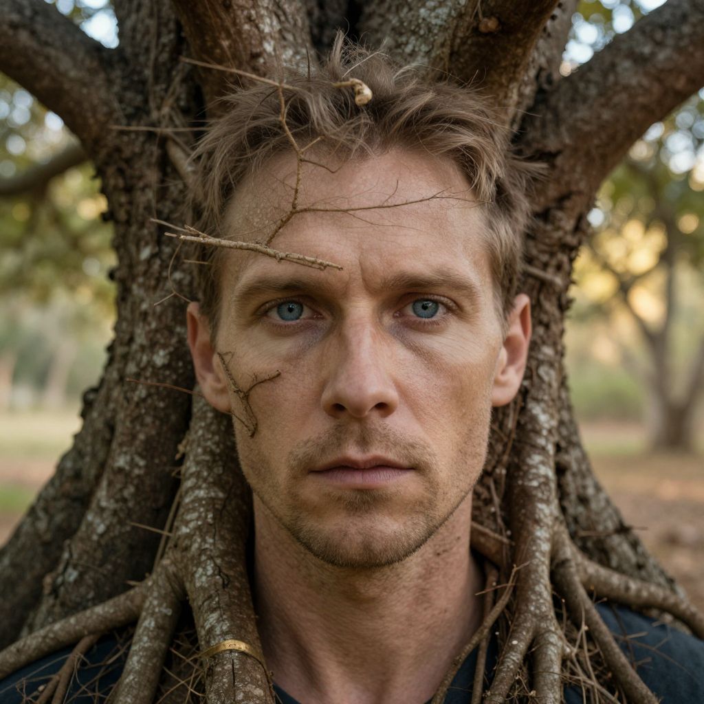 A captivating double exposure portrait reveals a rugged man with piercing blue eyes, his features gradually blending into an ancient tree's intricate bark pattern. The merging of man and nature seamlessly connects branches to his eyes and roots around his neck and shoulders. Soft golden sunlight filters through dense foliage, illuminating this visual metaphor that explores grounding and the connection between humanity and the natural world. The subject appears intertwined with yet distinct from the earthy tones and textures surrounding him, prompting contemplation on our relationship with nature. This emotionally powerful image transcends conventional boundaries.