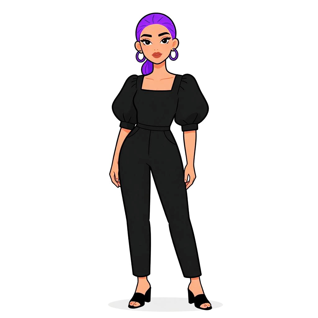 Woman with pretty face and pretty hair. Woman, modern minimalist, solid black jumpsuit, square neckline, gathered puff sleeves, cinched cuffs, fitted waist, straight-leg pants, black open-toe mules with block heels, large hoop earrings, slicked-back hair, white studio background. --sref 1467
