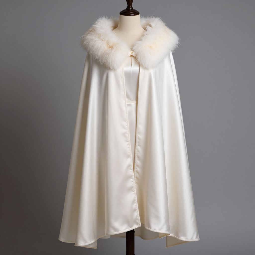 Ivory satin cloak featuring a luxurious fur-trimmed collar, elegantly draped over a mannequin, showcasing its mid-length design and classic bridal or renaissance-inspired style.