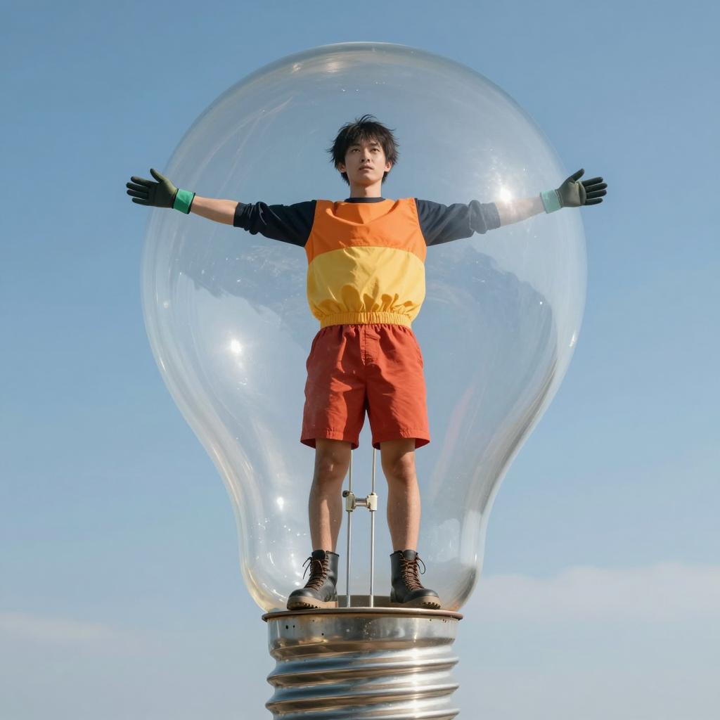 Man floating inside a large, transparent light bulb against a clear blue sky. Wearing orange and yellow outfit with black sleeves, red shorts, green gloves, and black boots. Arms and legs extended outward. Short black hair. Clear moon-like reflection on light bulb surface. Bright daylight.