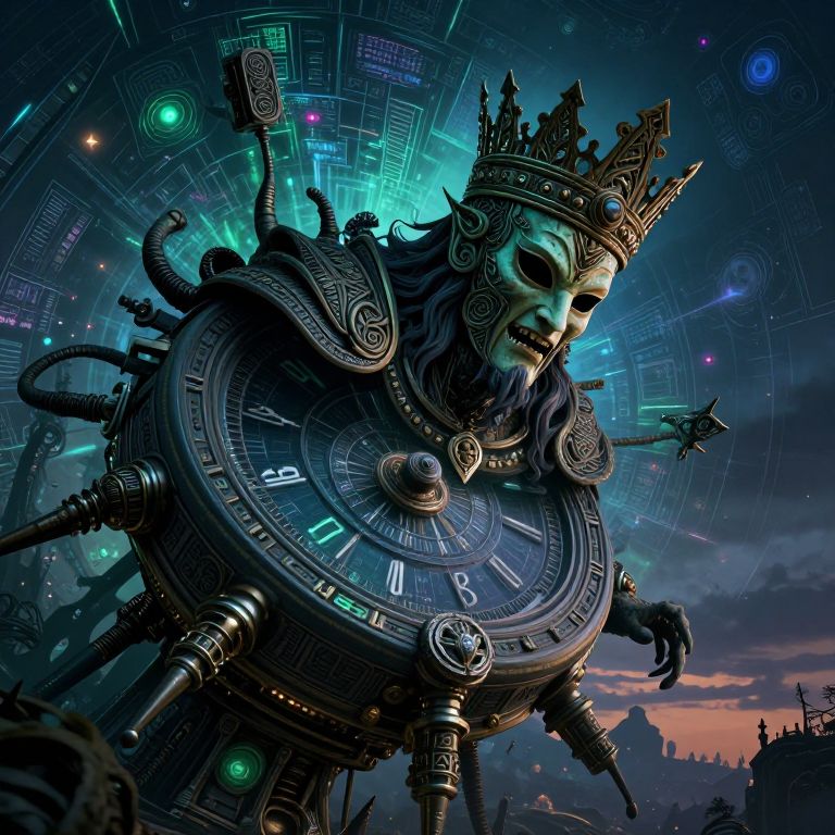 The image presents a highly detailed and intricate scene that blends elements of Celtic futurism with surrealism. At the center, a giant time machine, reminiscent of a Celtic king, watches over the twilight as it assembles itself in a biopunk-machine style. The time machine is adorned with elaborate, dark, and sinister jewelry and accouterments, including a tall, stately crown and a mask that exudes an intense, almost manic energy. The background is a complex, full-color, complete sinister quantum cybernetic matrix, with a dark, necrotic magic that adds to the overall ominous atmosphere. The scene is captured in a Dutch-angle perspective, enhancing the surreal and intense nature of the image. The composition is dynamic, with various elements interacting and overlapping, creating a sense of depth and complexity. The interplay of colors, textures, and shapes is rich and varied, with shades of blue, green, and black dominating the palette. The overall effect is one of dark fantasy and dark art, with a strong emphasis on intricate detail and surrealism.