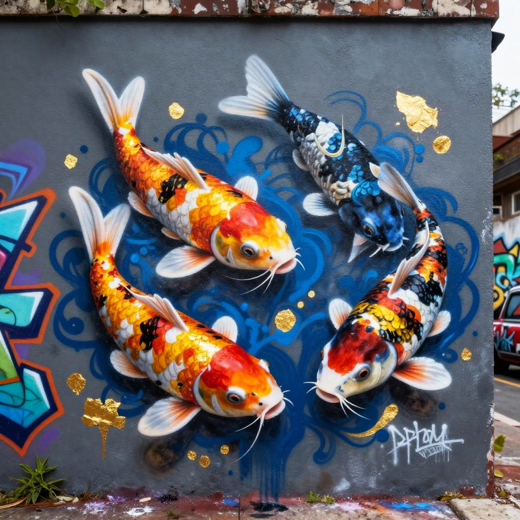 Samurai Koi graffiti art, neo-noir street mural, spray paint with gold leaf accents, ultra detailed, ultra quality, colorful polychromatic.