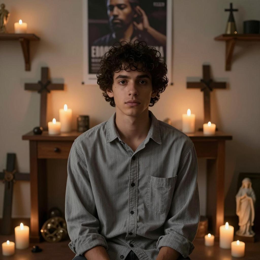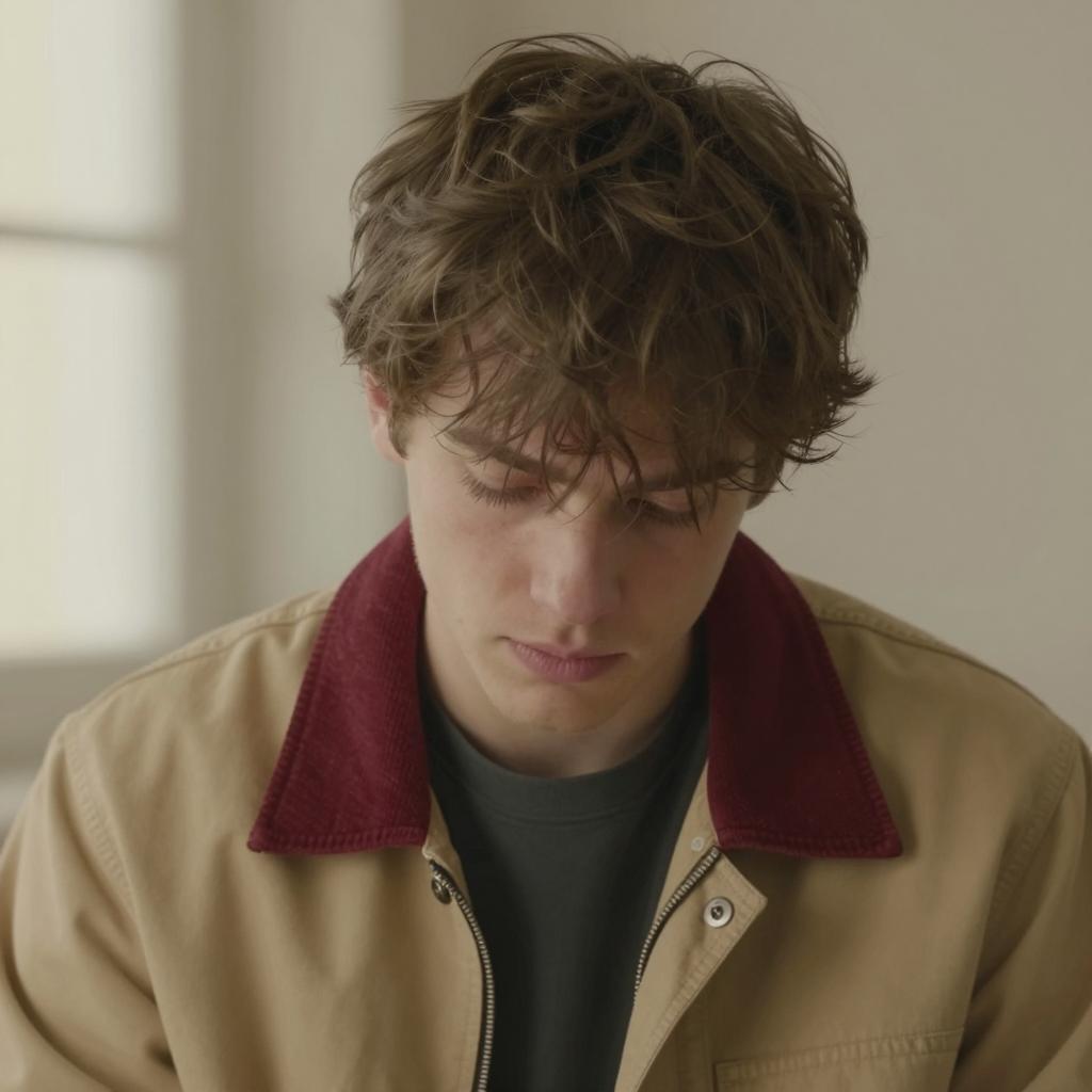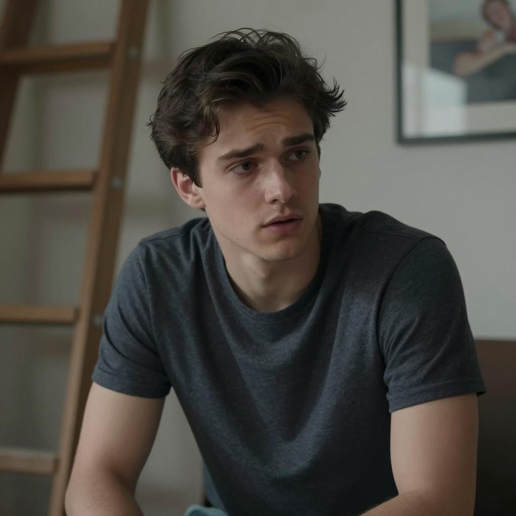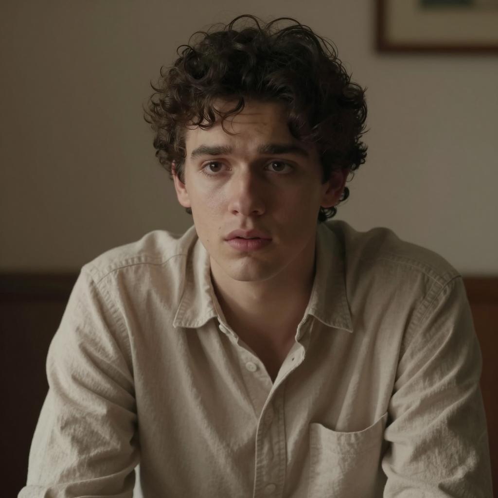 A young man with fair skin, dark curly hair, and brown eyes. He wears a slightly wrinkled beige shirt, sitting in a dimly lit room. His face shows a concerned expression, with slightly parted lips. Background is blurred with dark brown and beige tones.