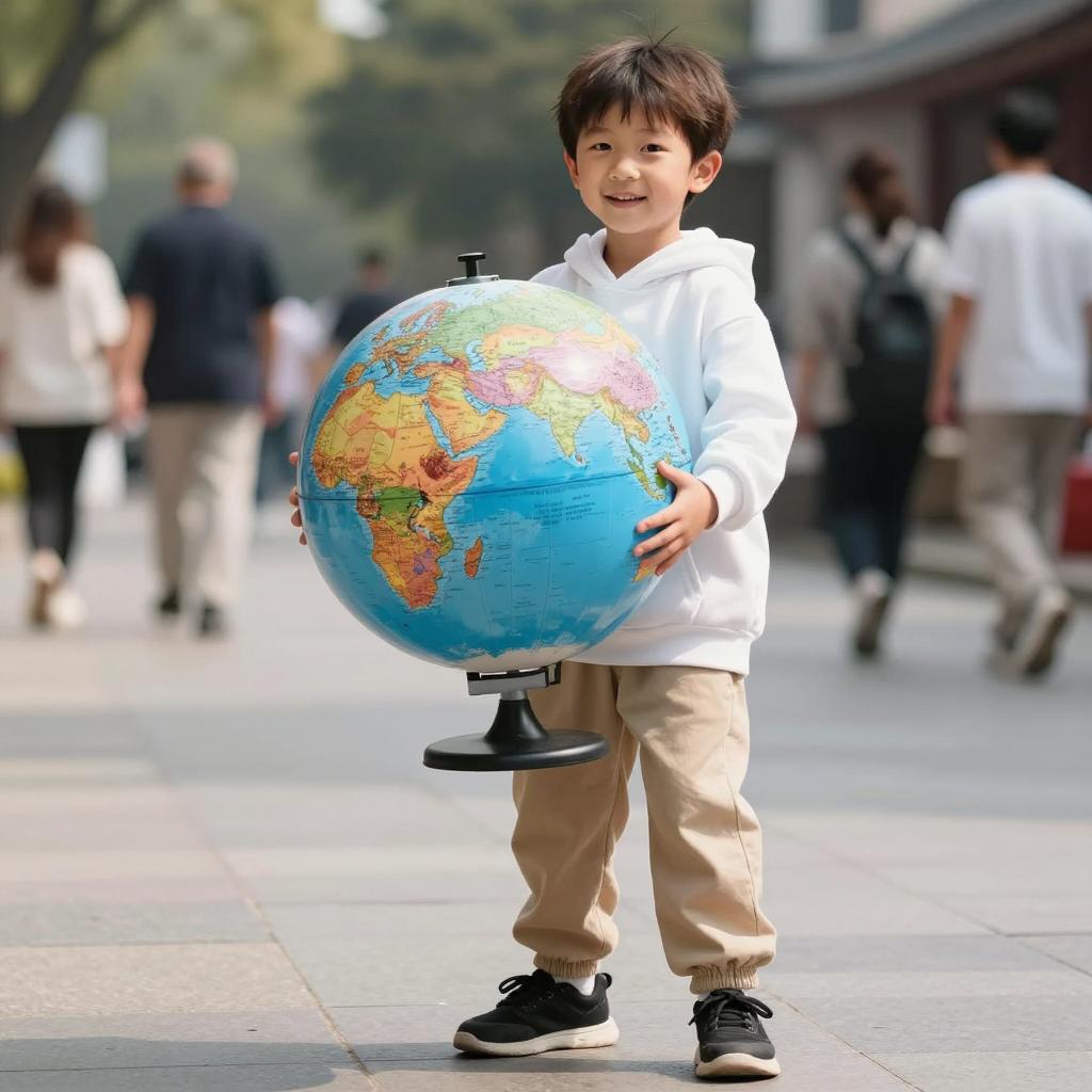 Round earth kid costume, photograph of young boy holding large globe, standing on sidewalk, daytime, outdoors, summer, short brown hair, light skin, wearing beige pants, black shoes, white hoodie, smiling, blurry background with people and trees, bright sunlight, vibrant colors, realistic, natural light, candid, street setting