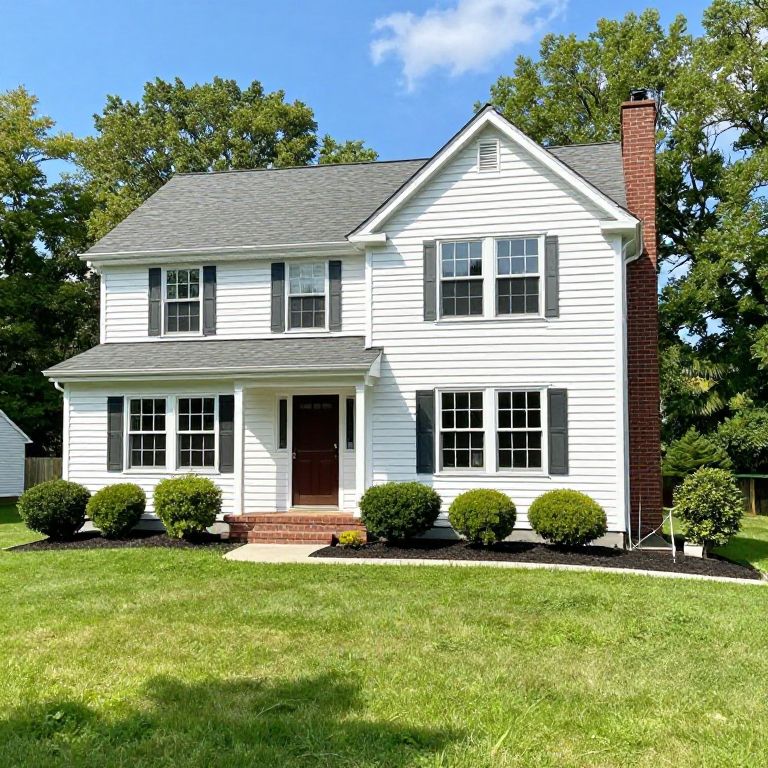 Sunny two-story home in Langdon, NH 03602, featuring a gray roof, white siding, brick chimney, and landscaped front yard with manicured shrubs, priced at $950,000.