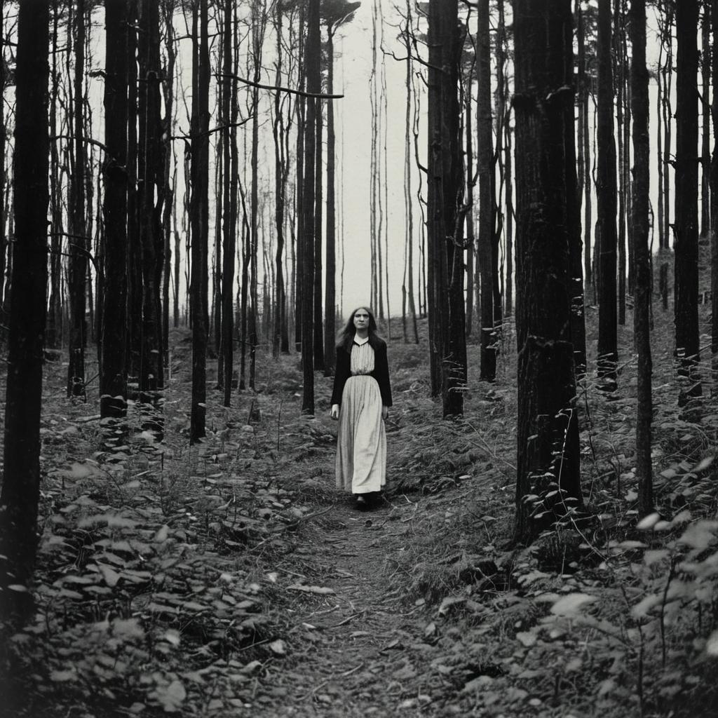 Black and white photo of a woman with long hair wearing a long dress and a dark jacket walking along a narrow path through tall, slender trees in a dense forest. The scene has a somber, quiet atmosphere with minimal underbrush and stark tree trunks.