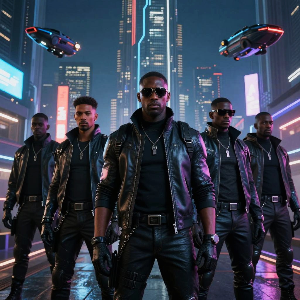 Group of big black men in a futuristic cityscape, wearing sleek cyberpunk clothing with neon accents, towering skyscrapers and flying vehicles around, night scene illuminated by glowing signs, highly detailed sci-fi aesthetic.