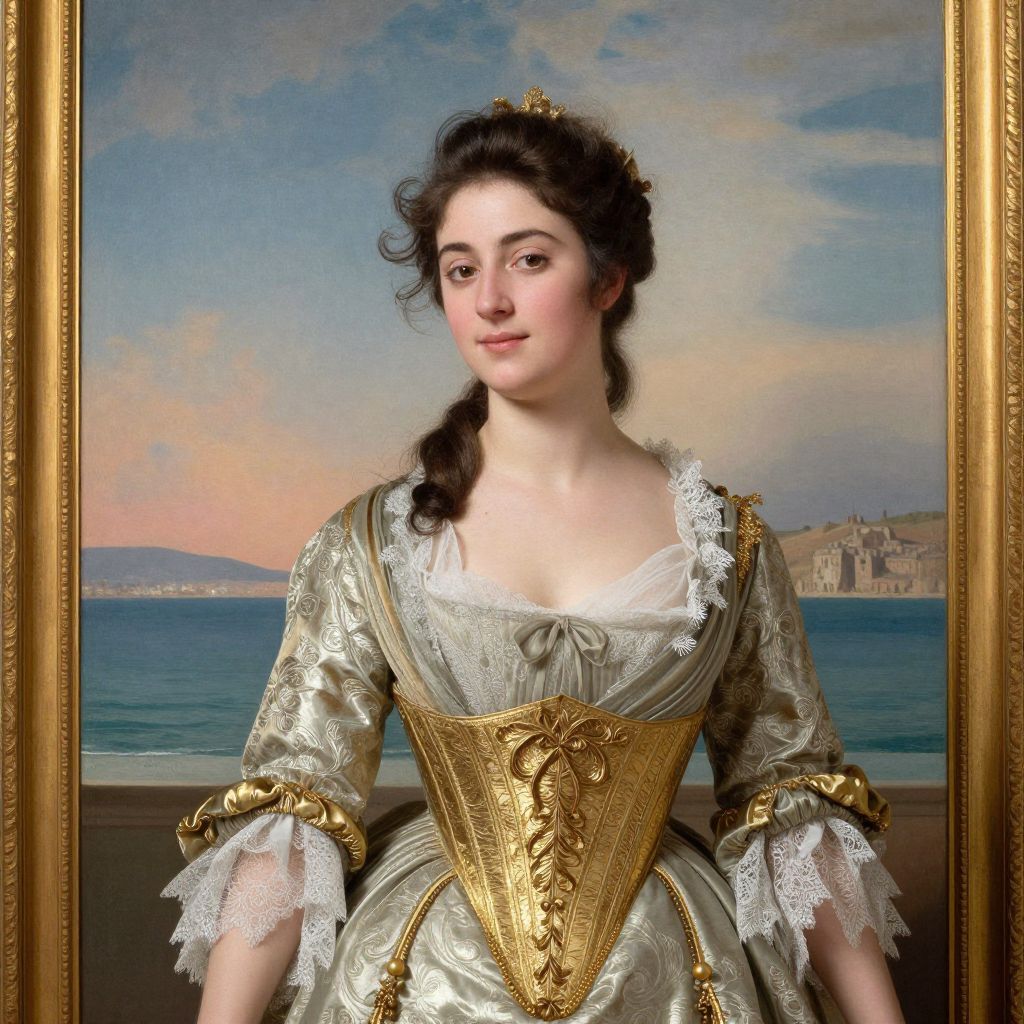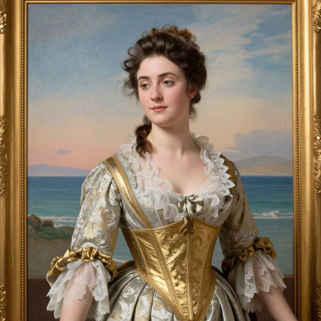 A classical portrait in the neoclassical style, reminiscent of Edouard Picot's work, depicts a woman adorned in an elegant, lace-trimmed gown with a gold corset, set against a serene coastal landscape framed by ornate golden detailing, showcasing meticulous attention to detail and a timeless, high-definition aesthetic.