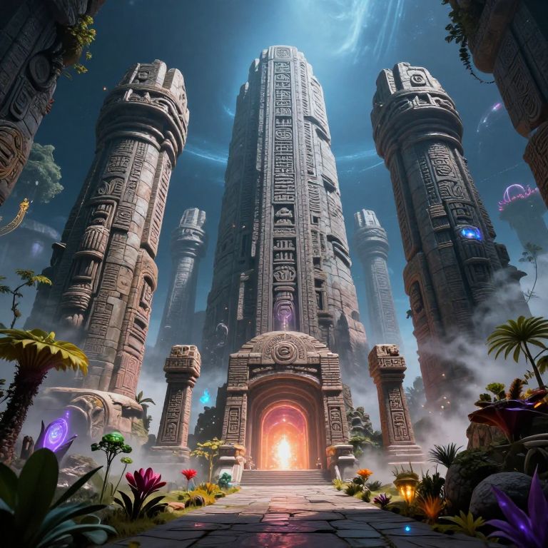 Metagala ancient alien ruins on a distant planet, massive stone structures with intricate carvings, surrounded by exotic flora, mysterious energy glowing softly, dramatic lighting with fog effects, science fiction exploration theme, vibrant color palette
