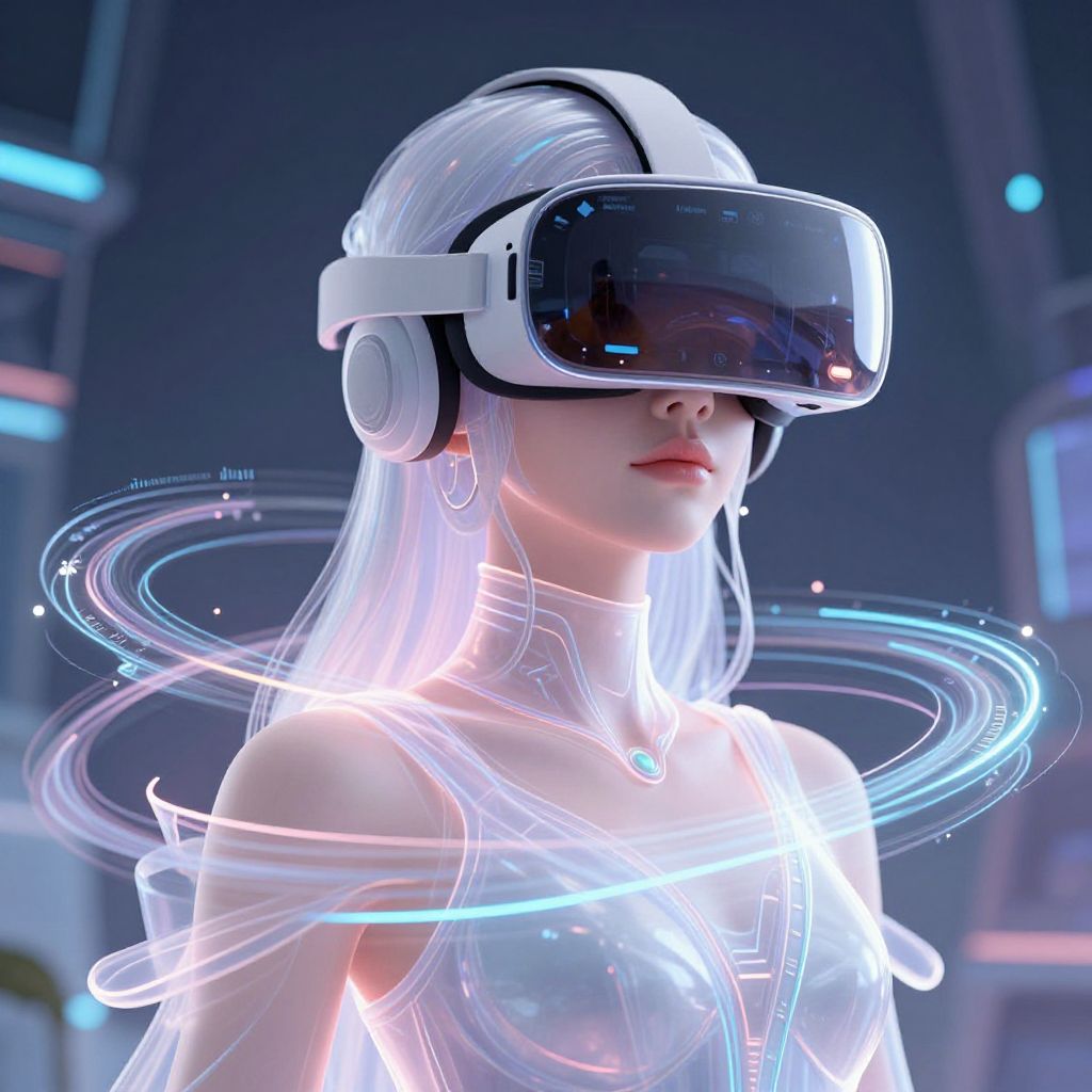 VirtualGF visualized inside a sleek VR headset interface, transparent display showing her avatar with elegant sci-fi attire, soft pastel neon glow, abstract data streams swirling around, serene expression, ultra-detailed futuristic background inspired by advanced AI technology and immersive virtual spaces.