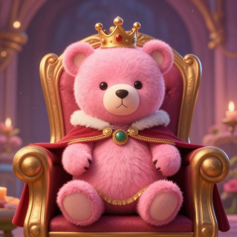 Pink bear character wearing a tiny crown and royal cape, sitting on a throne in a fairy tale kingdom, detailed texture, storybook illustration, magical lighting