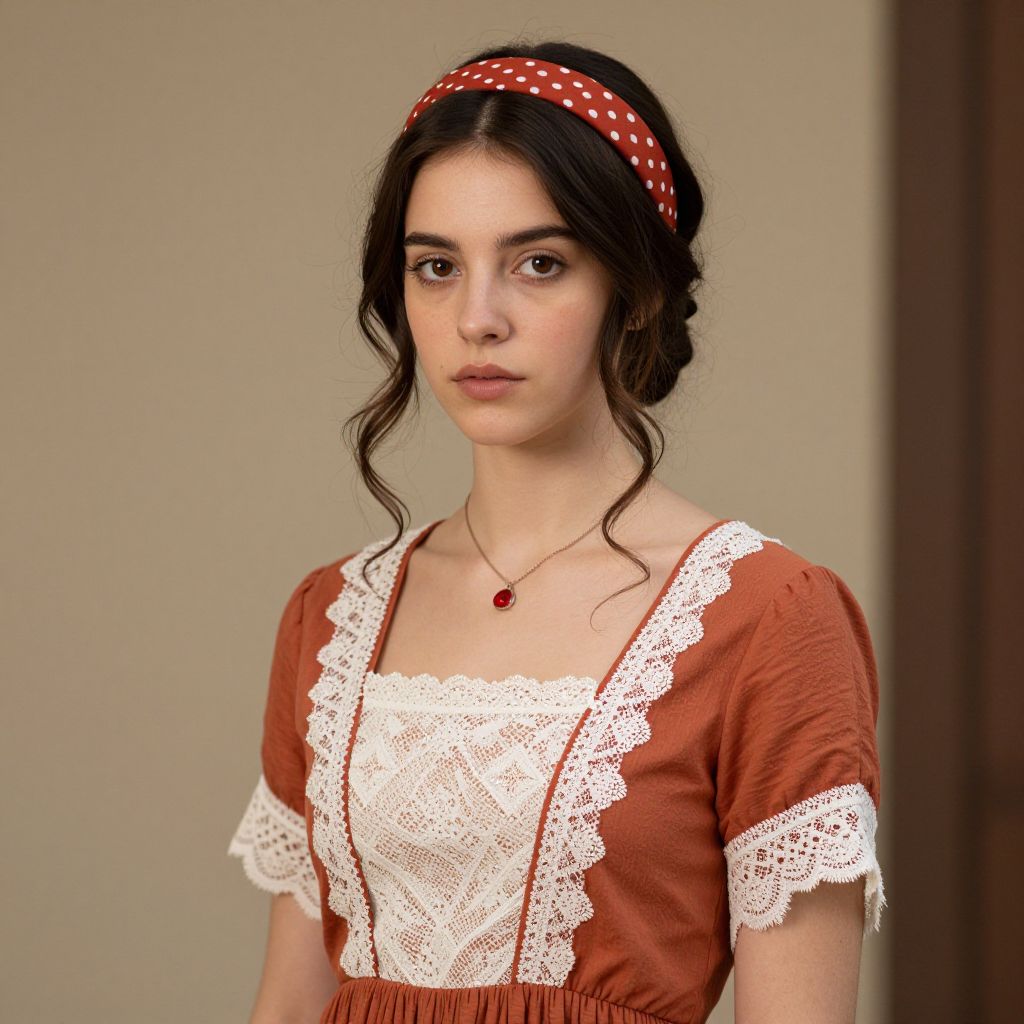 Photograph of a young woman with fair skin and dark brown hair, styled in a loose updo with a red polka-dotted headband. She's wearing a vintage-style, rust-colored dress with white lace detailing on the bodice and sleeves. Her expression is calm and she's standing in front of a blurred, beige and brown background. She has a small, delicate necklace with a red pendant.