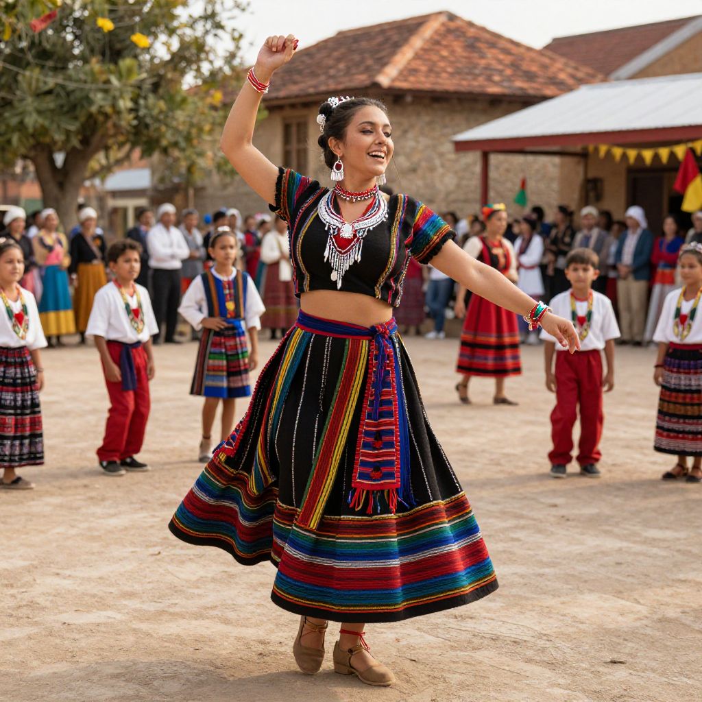 Actress prompt: A joyful actress dances in a sun-drenched village square during a traditional festival, wearing colorful handwoven fabric and local jewelry, children around her, vibrant cultural elements, warm lighting, authentic and lively atmosphere.