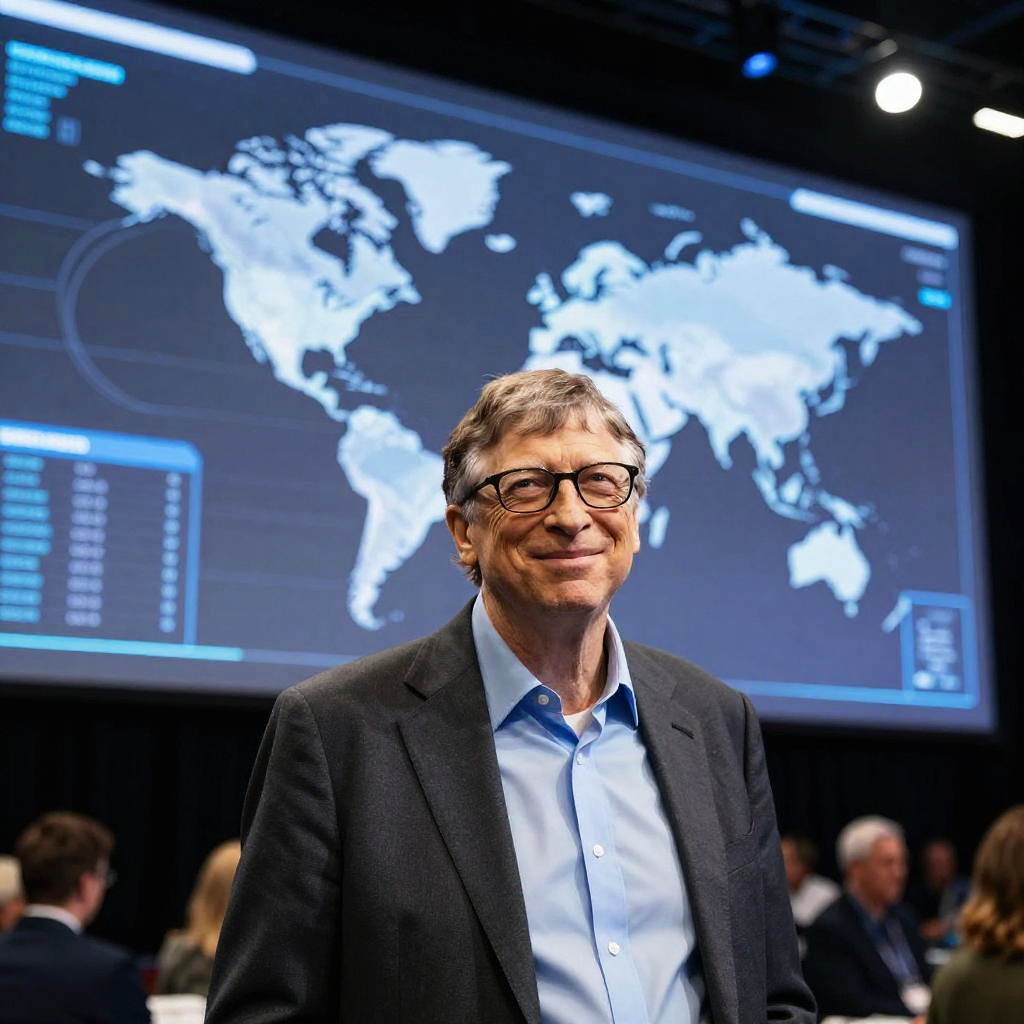 Bill Gates smiling subtly in front of a giant holographic screen showing world maps and data, futuristic tech conference ambiance, ultra-detailed, cinematic sci-fi style