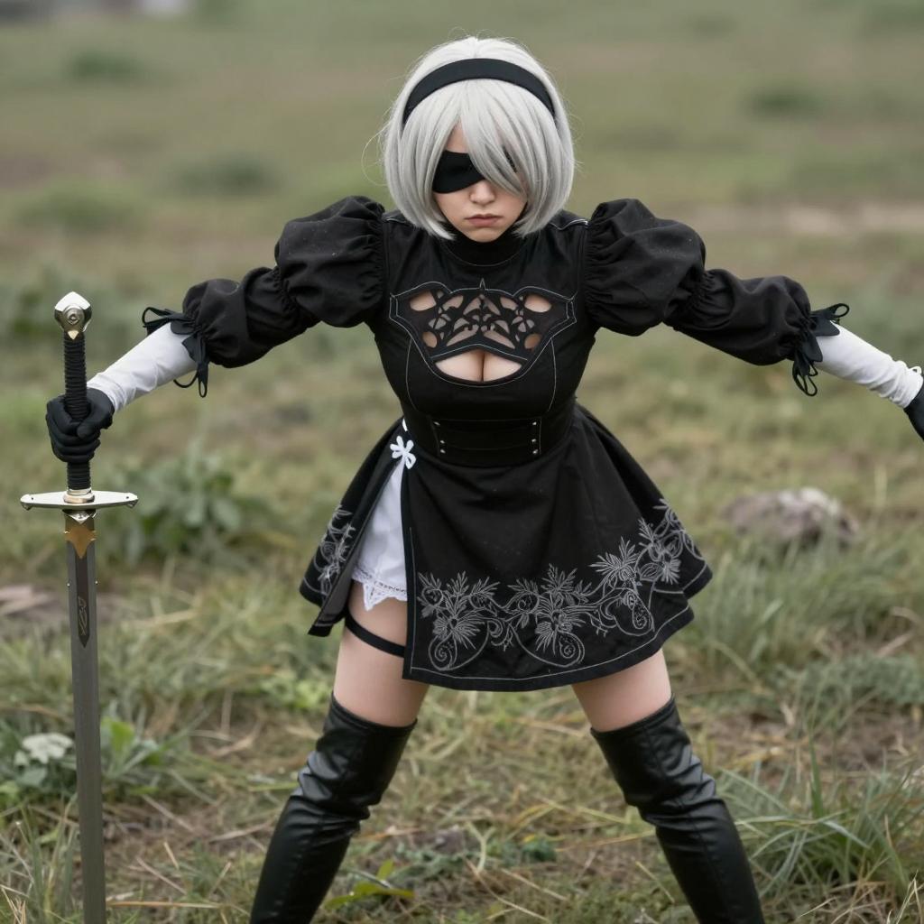 Female cosplay character with short silver hair, black blindfold, black dress with lace and floral patterns, thigh-high black boots, white underwear, black gloves, holding sword, leaning forward with arms outstretched, standing in grassy field, bright daylight, intense facial expression, 1 person.