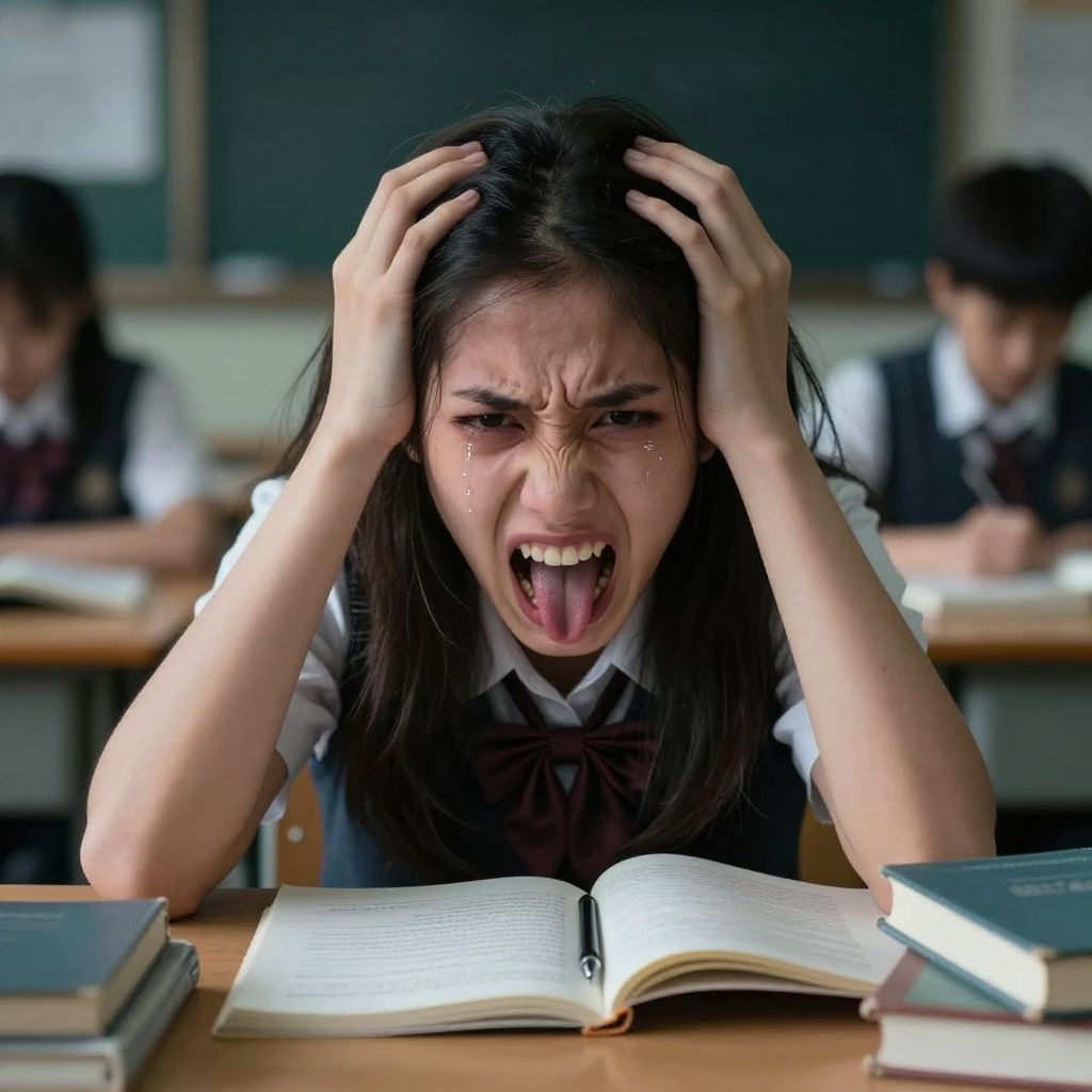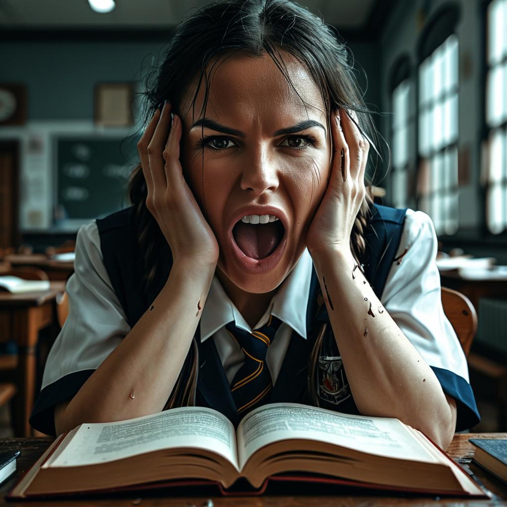 (masterpiece:1.3), (best quality:1.2), 8k, absurdres, unity 8k wallpapper, (extremely detailed:1.3), highestres, 1girl, looking at viewer, open_mouth, (screaming:1.2), indoors, blurry background, pain, (angry:1.3), frown, widely opened eyes, solo, sad, wrinkled skin, hands on own head, sharp teeth, fangs, school uniform, books, pen, table, (tears:1.3), tongue, night, study, shouting