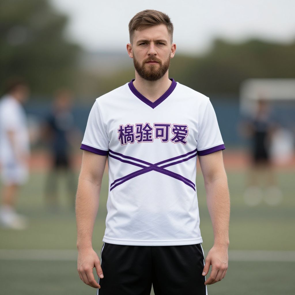 "man cheerleader costume, male focus, facial hair, blurry background, blurry, 1boy, shirt, beard, short hair, outdoors, black pants, solo focus, standing, sportswear, arms at sides, shorts Realistic photo of casual sexy person with pretty face"