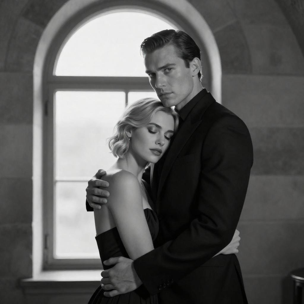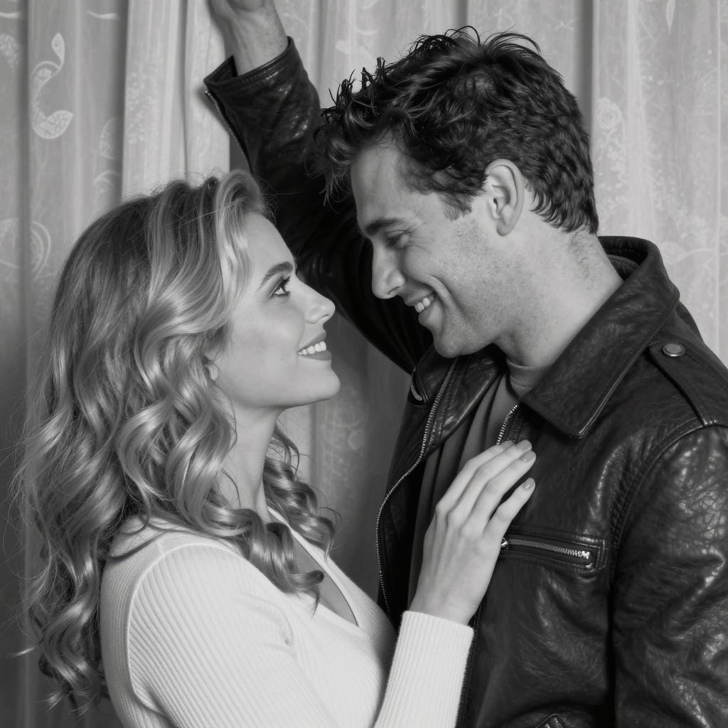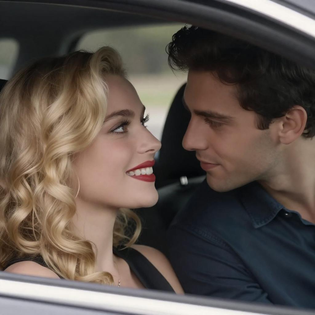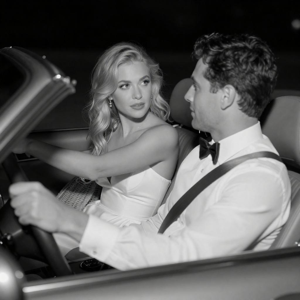 Black-and-white photograph of a man and woman in a convertible car. Woman with blonde hair, white dress, and wicker purse leaning towards man. Man with dark hair, light shirt, and bow tie looking at her. Woman's arm extended, man's hand on steering wheel. Intense facial expressions. Nighttime background. Car's interior visible.