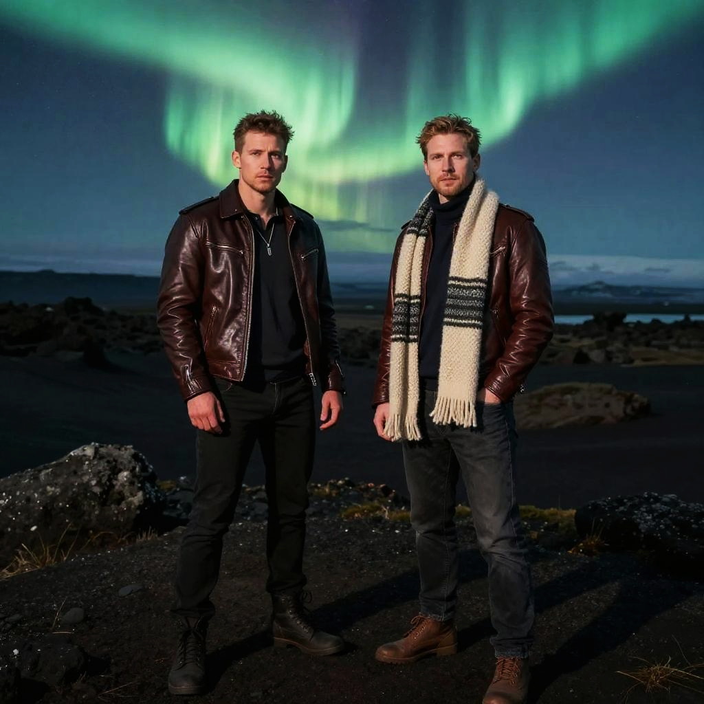 Model Icelandic men standing on rugged volcanic terrains under the northern lights, wearing stylish leather jackets and wool scarves, photorealistic, cinematic lighting