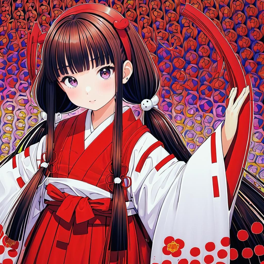 Digital anime-style illustration of a young girl with long black and brown hair styled in low twintails, blunt bangs, and brown eyes. She is dressed in traditional miko attire featuring a red hakama skirt, white haori with red details, and a red headband. The background is composed of vibrant red, orange, and purple abstract patterns.