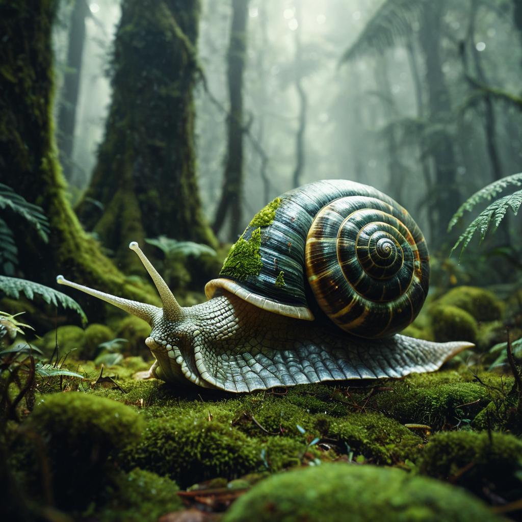 Giant Moss-Covered Snail-Dragon Hybrid in Rainforest