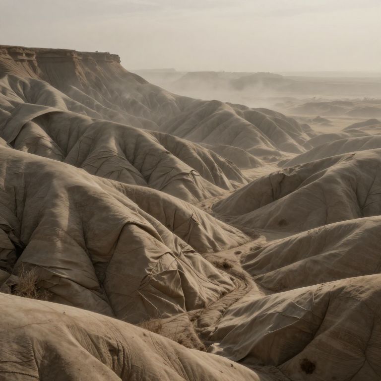 Surreal landscape featuring wrinkley hills and valleys resembling crumpled fabric, muted earth tones, soft mist hovering over terrain, fantasy environment, concept art style with dramatic lighting