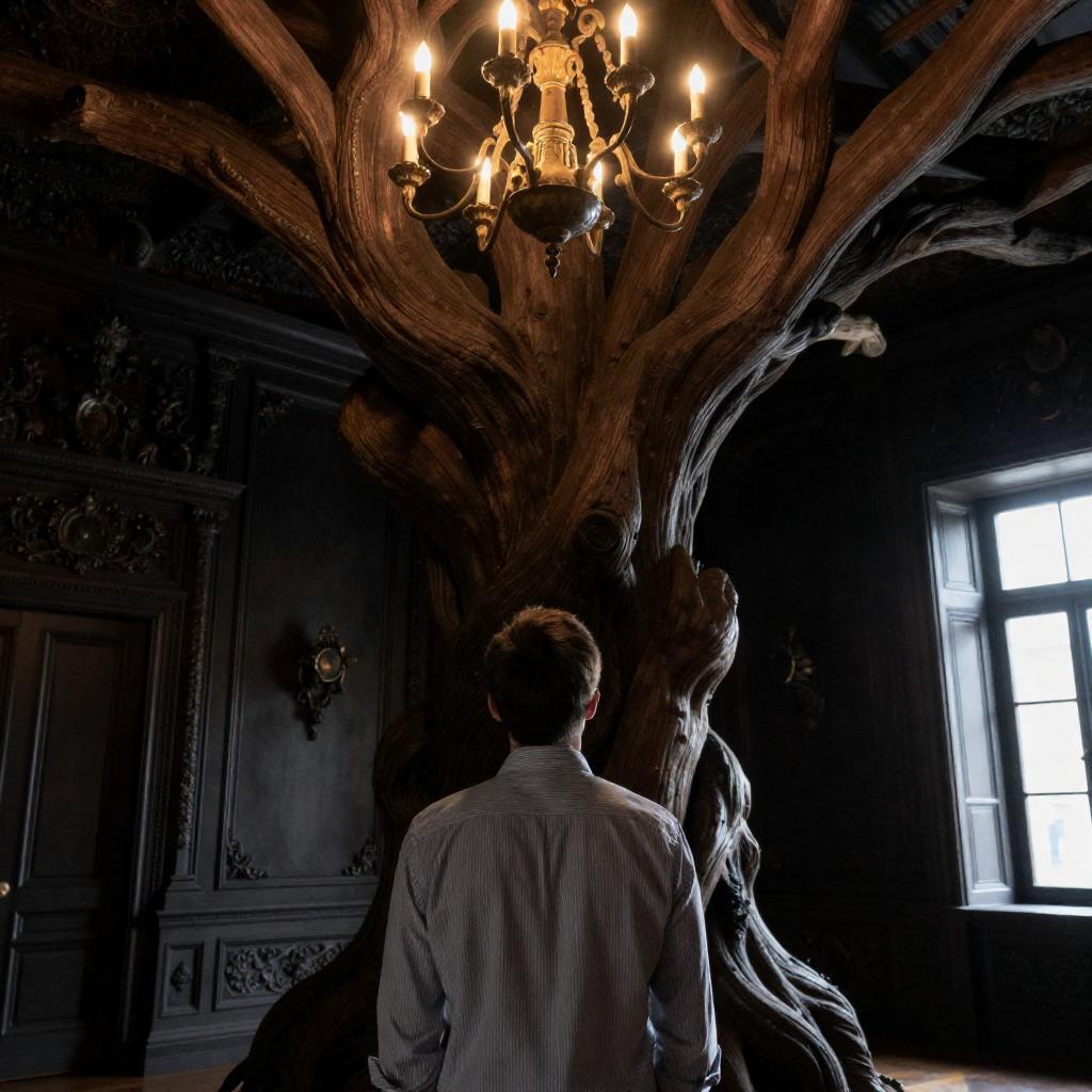 Photograph of a large, ured, tree-like creature with gnarled, dark brown bark and intense eyes, facing a man with short brown hair and a navy blue jacket, seen from behind. Background shows a cloudy sky and a distant village.