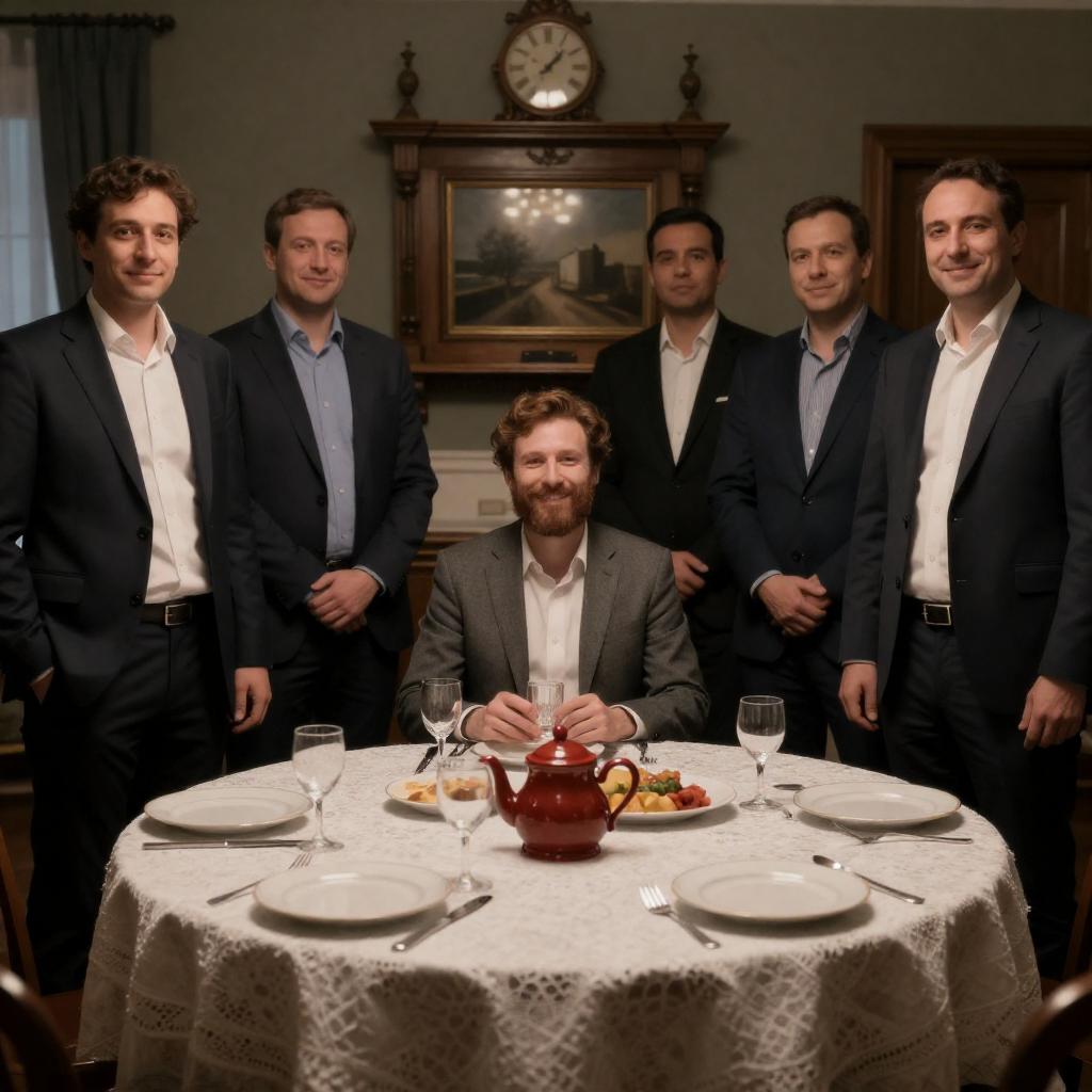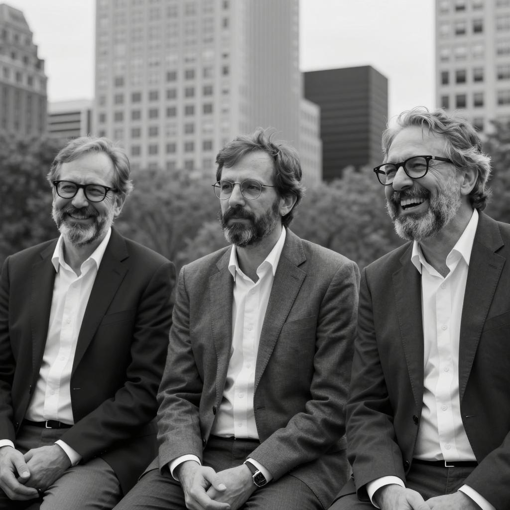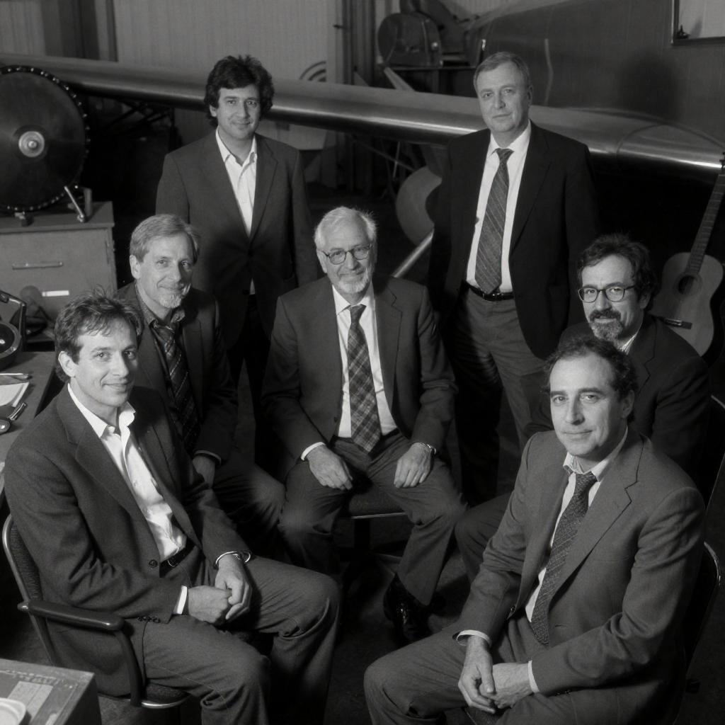 Black-and-white photograph of six middle-aged men in suits, sitting and standing in a cluttered, industrial setting. Five men have glasses; one has a beard. Background includes aircraft parts and machinery. Men are smiling or smiling slightly. Five men in front, one standing in back. Lighting is dim, creating shadows. Objects include chairs, a guitar, and tools.