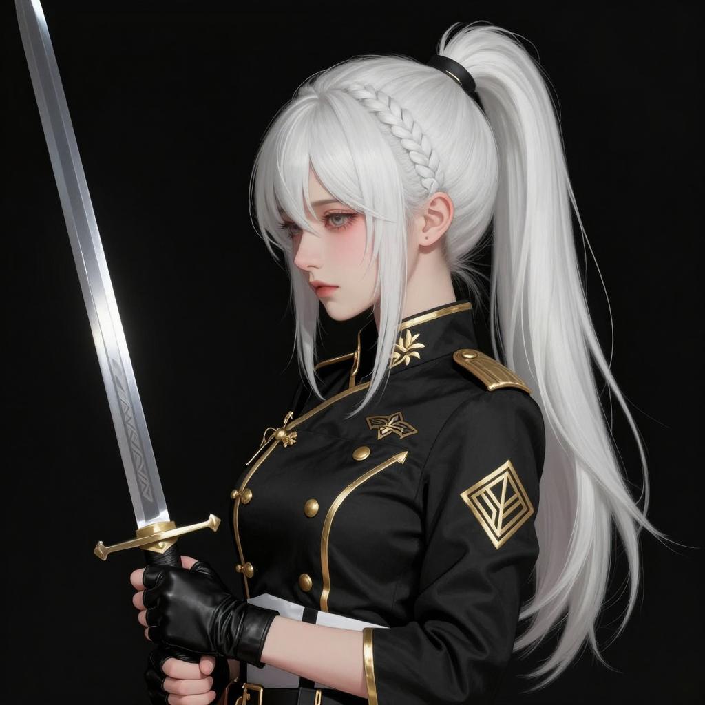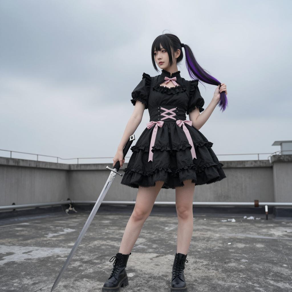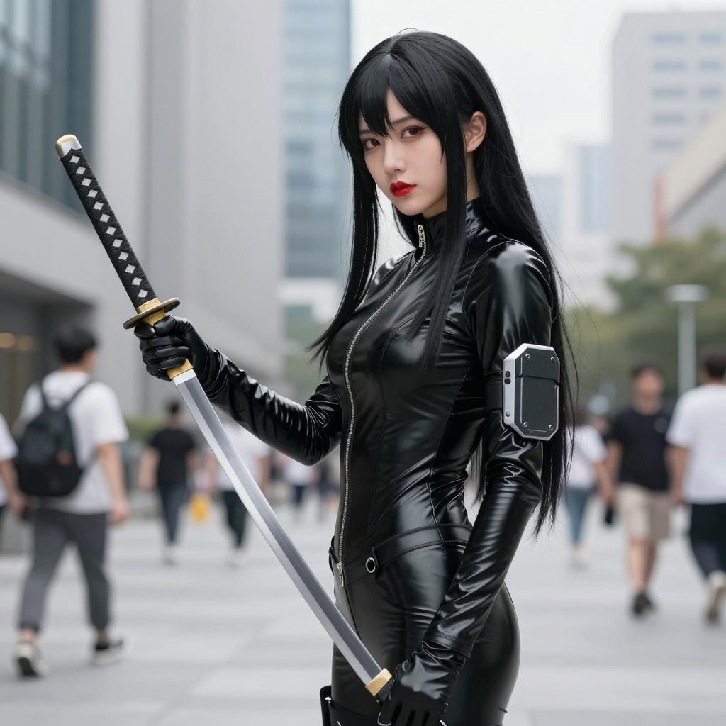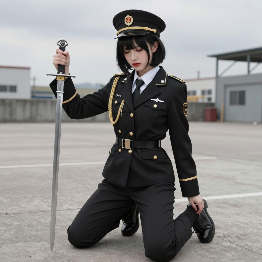 Photograph of an anime-style woman with long black hair, wearing a black military-style uniform with red accents, black cap with star and chain details, black gloves with lace, holding a sword in a ready position. Background is an outdoor urban setting with blurred buildings. Her expression is intense. She is positioned in a dynamic, slightly crouched stance with her sword arm raised.